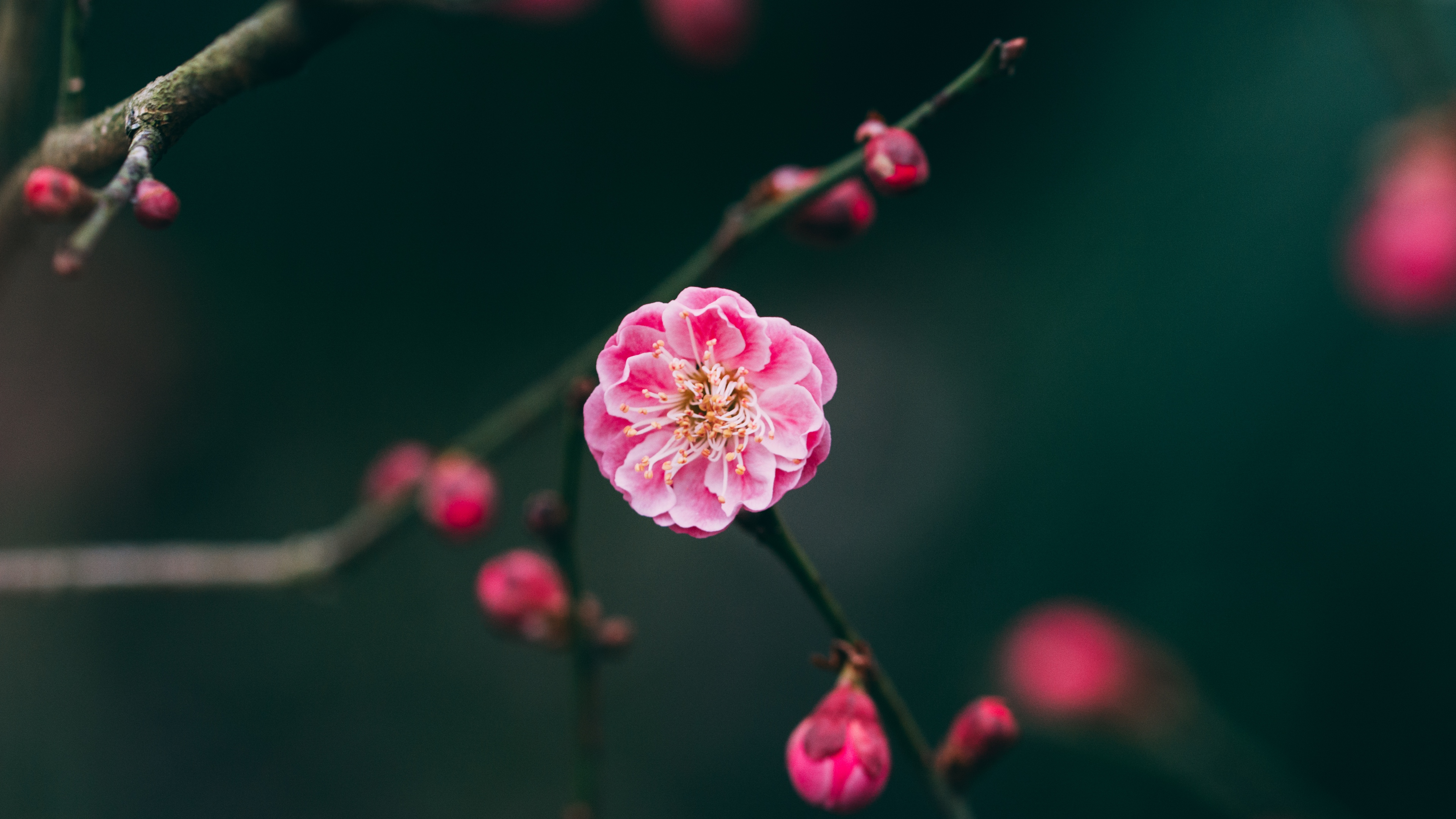 Description: A pink flower is blooming on a tree branch with buds on it and a green background with a few pink flowers.