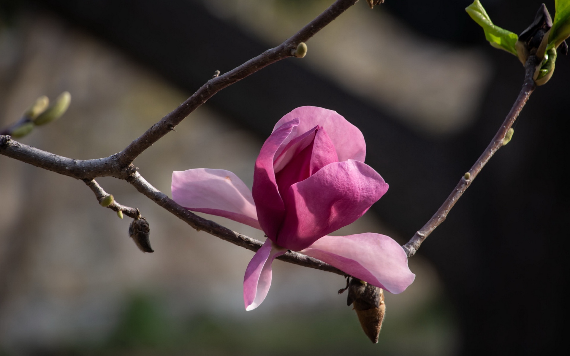 Description: A pink flower is blooming on a tree branch in the sun light of the day.