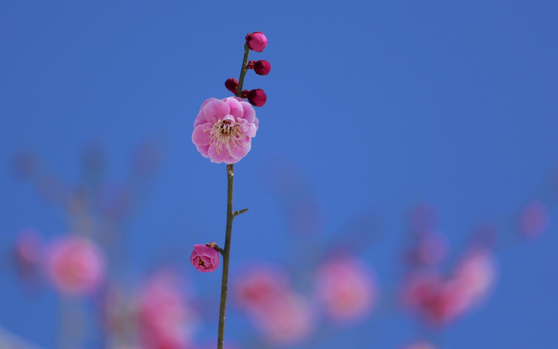 Description: A pink flower with a blue sky in the background is seen from below it is a thin stem with pink flowers.