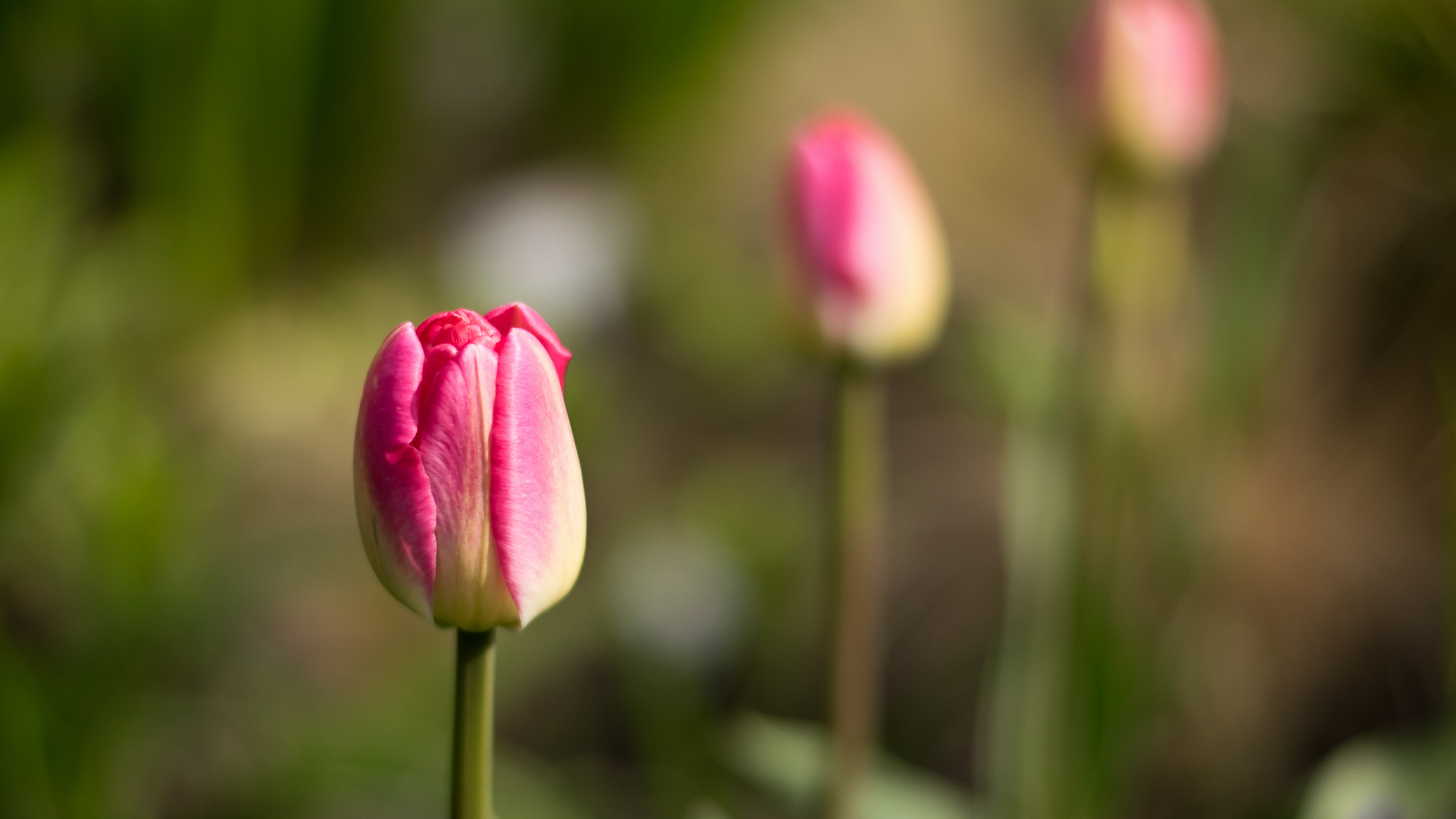Description: A close up of a pink flower with a blurry background of green grass and flowers in the background.