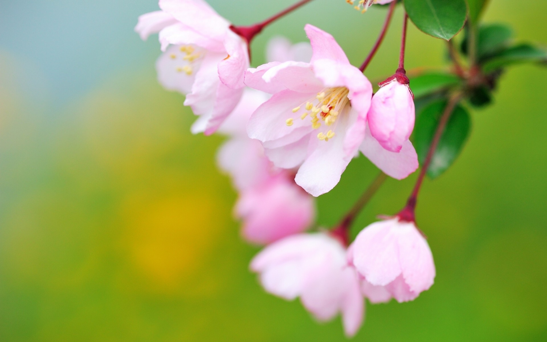 Description: A close up of a pink flower on a tree branch with green leaves in the background and a blurry background.