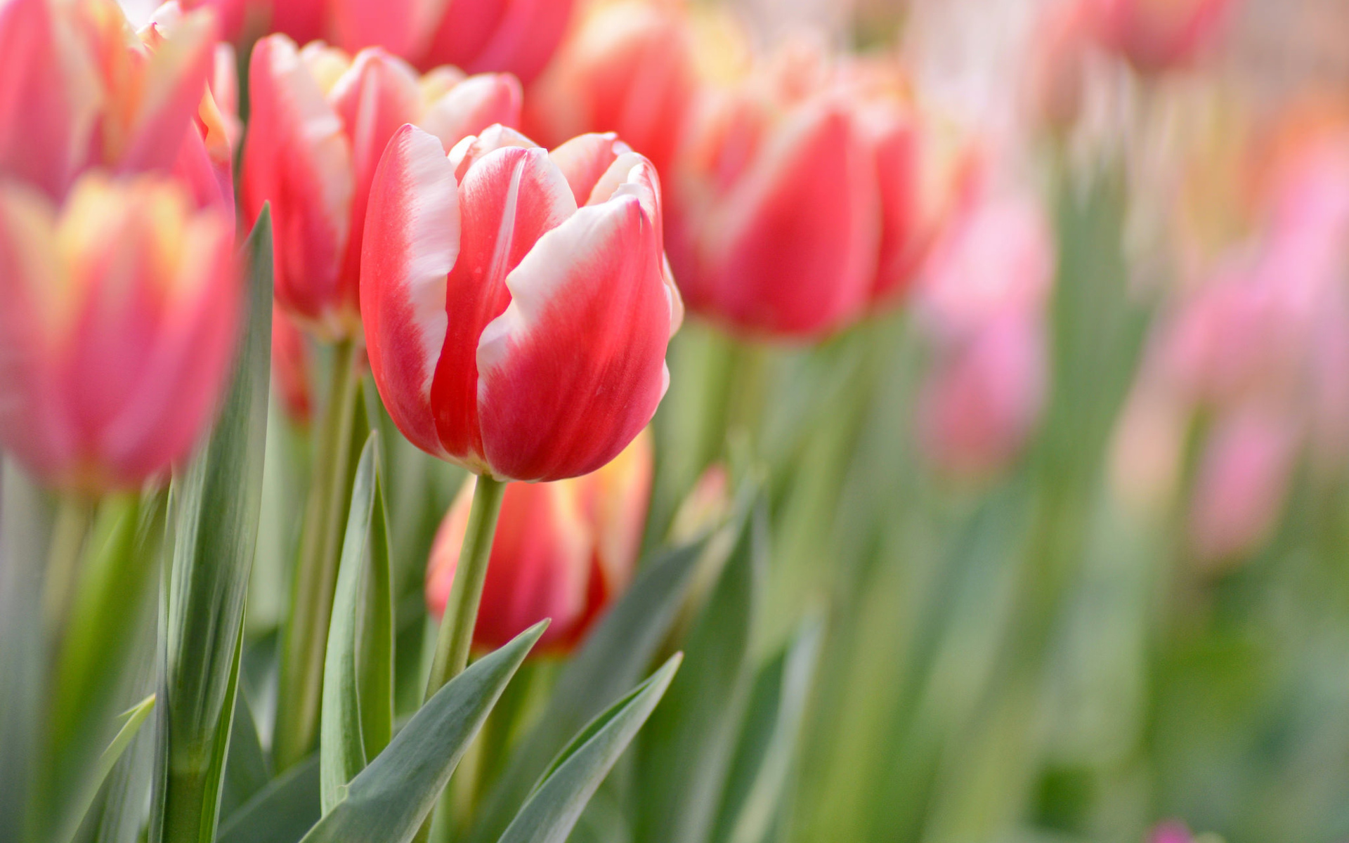 Description: A close up of a bunch of flowers with a blurry background of the flowers in the background is a field of red and white tulips.