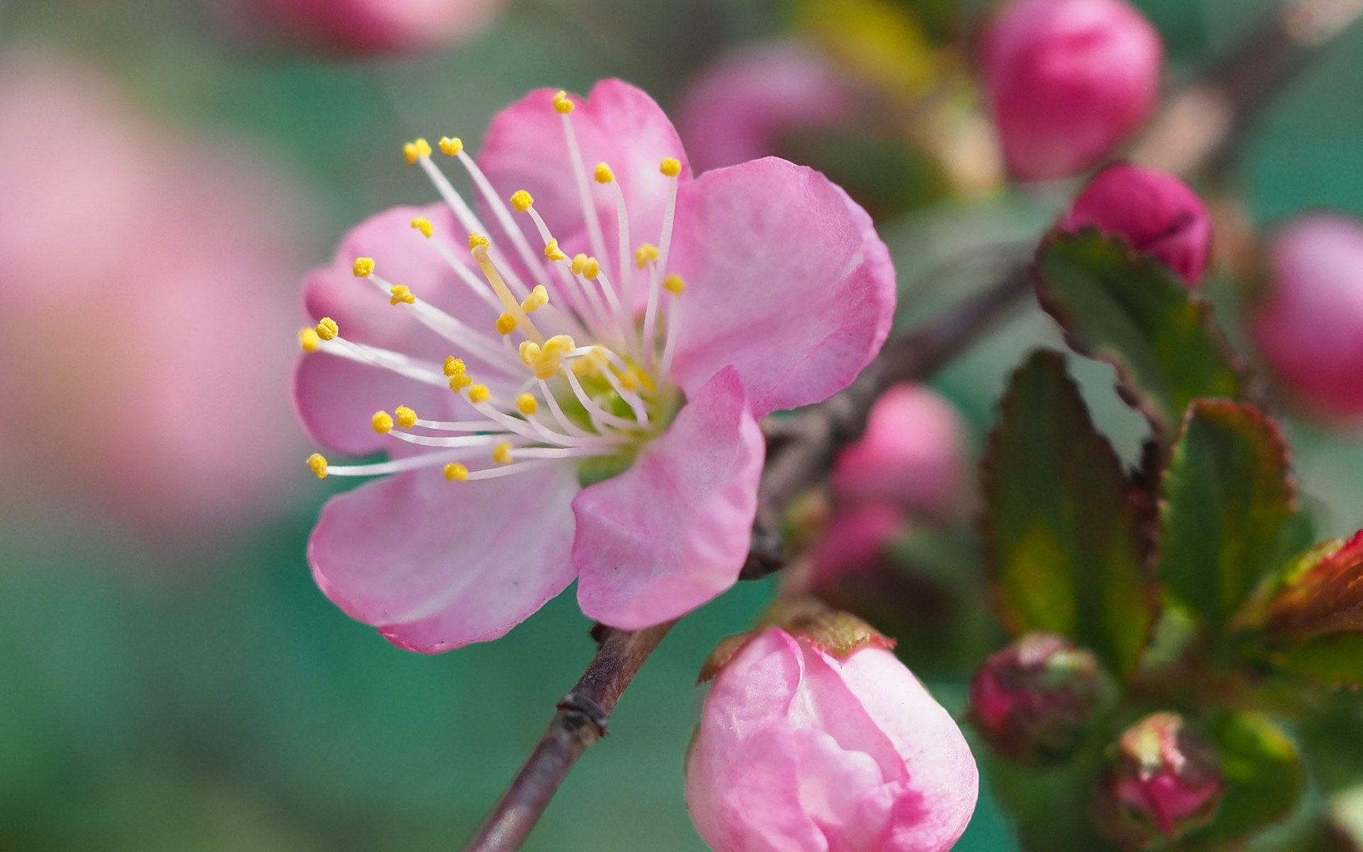 Description: A close up of a pink flower on a tree branch with other flowers in the background and a blurry background.