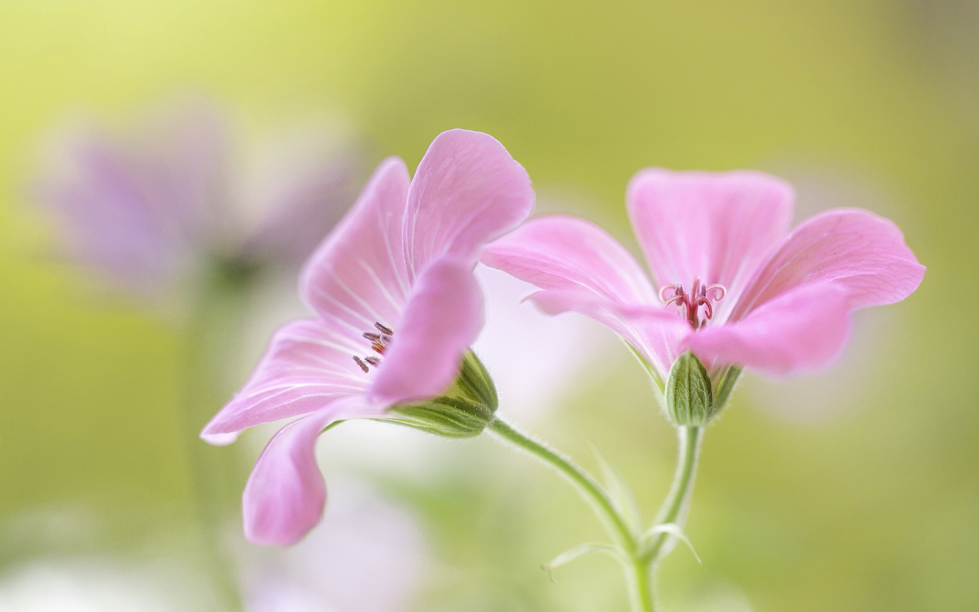 Description: A close up of a pink flower with a blurry background of flowers in the background.