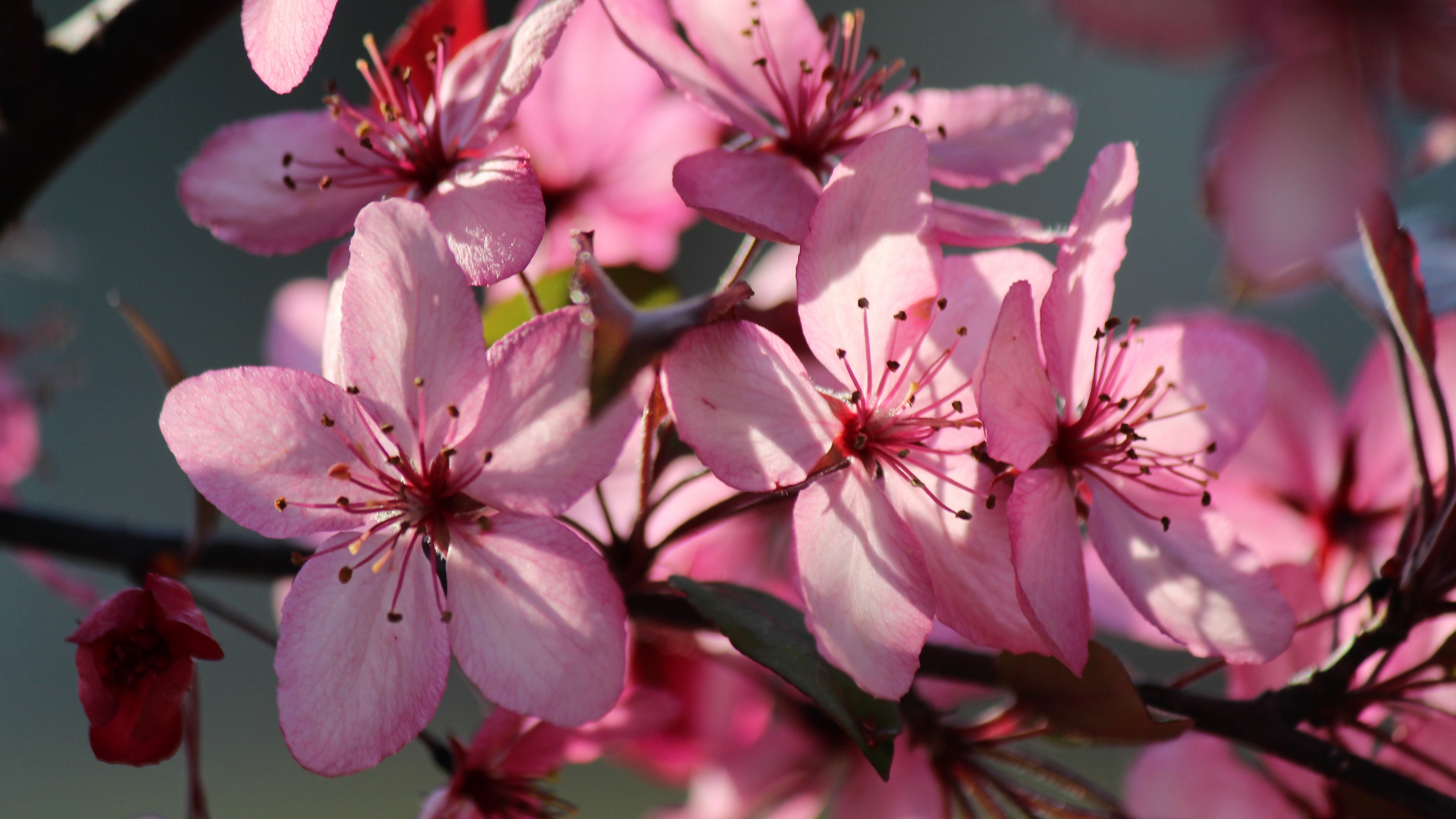Description: A close up of a bunch of pink flowers on a tree branch with a blue sky in the background.