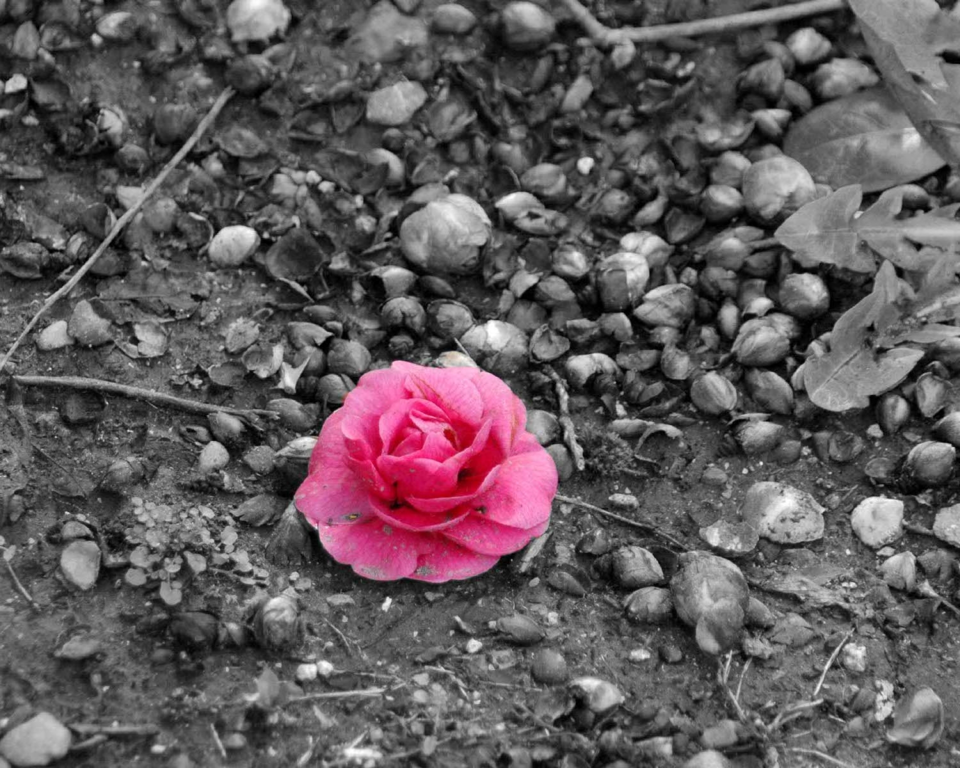 Description: A pink flower is sitting on the ground in the dirt and rocks and gravel is around it and is almost black and white.