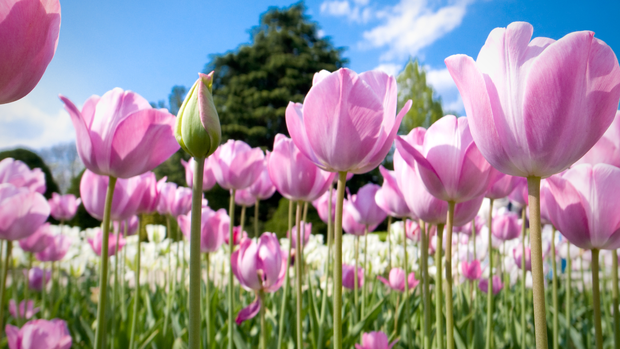 Description: A field of pink flowers with a blue sky in the background and a few clouds in the sky above.