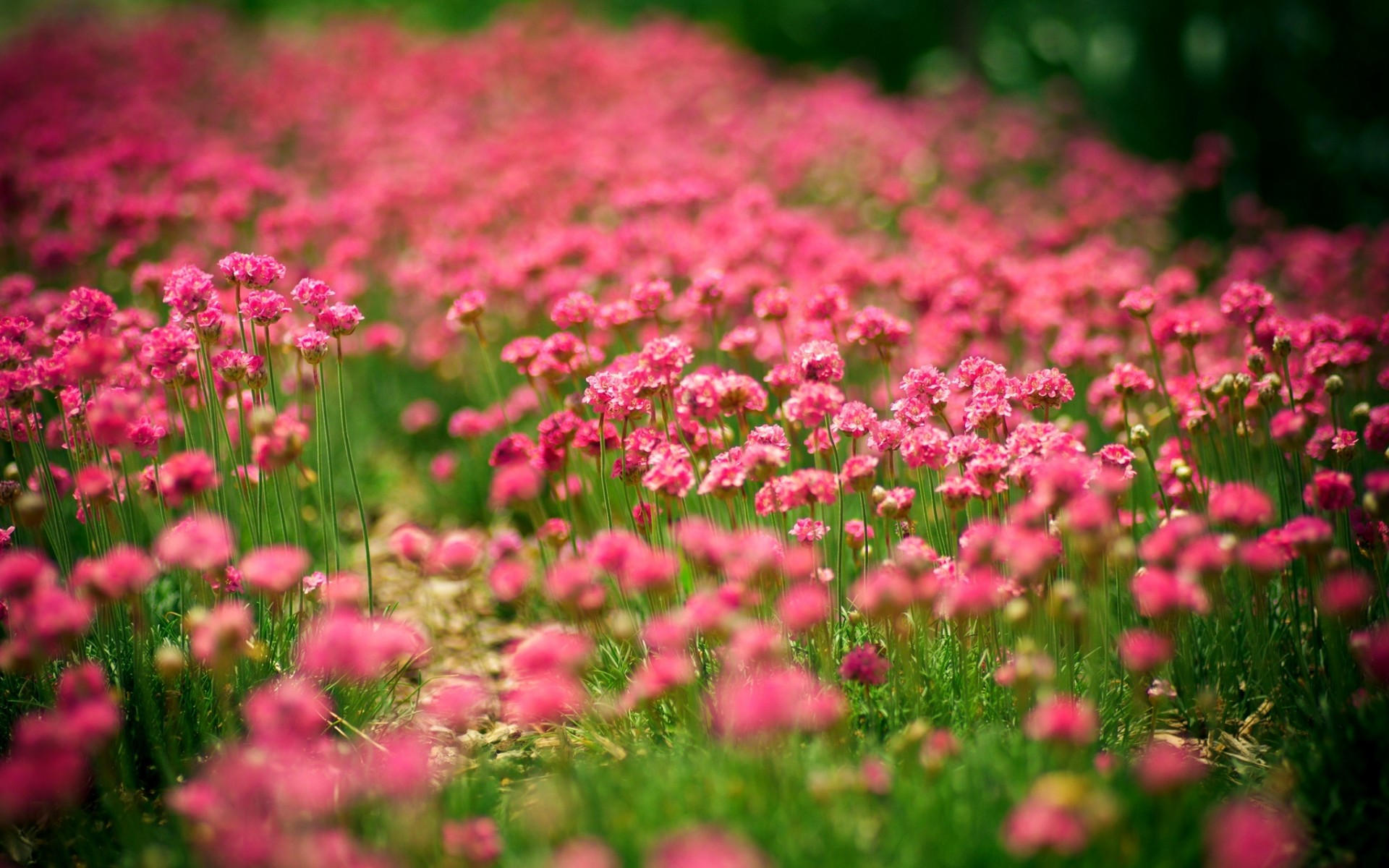 Description: A field of pink flowers with green leaves in the background and a blurry image of the flowers in the foreground.