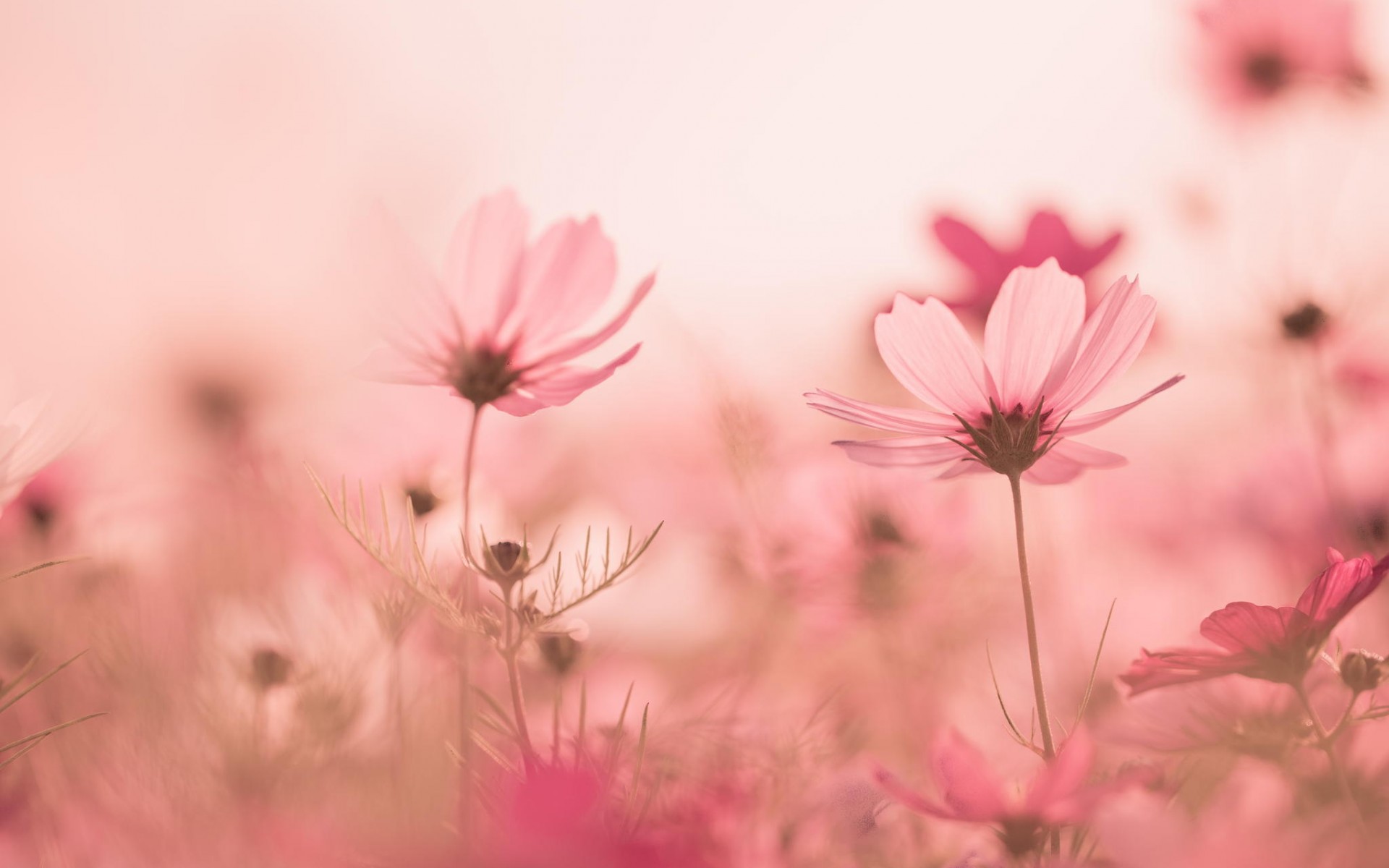 Description: A field of pink flowers with a sky background in the background and a pink sky in the background with a few pink flowers.
