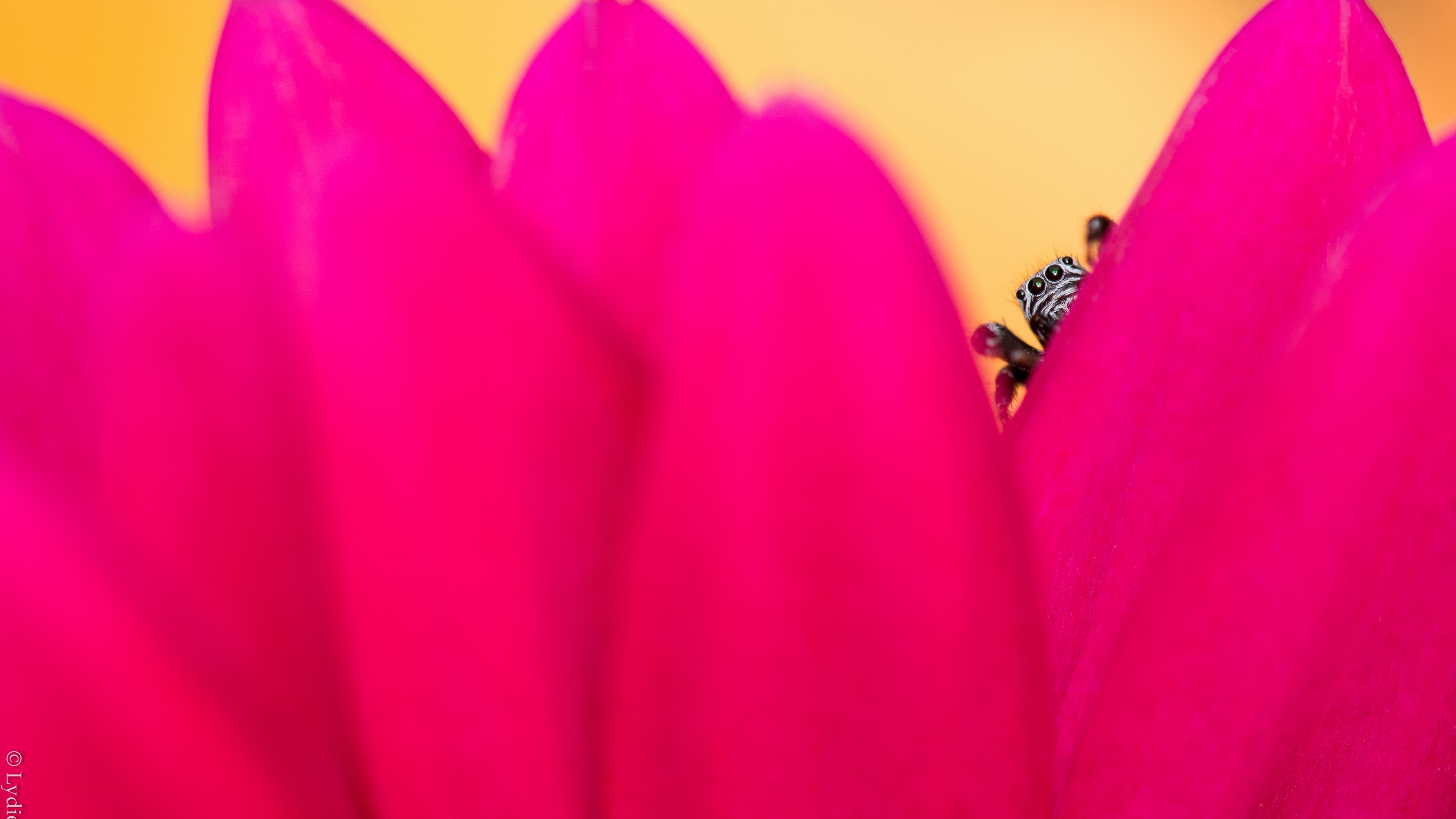 Description: A close up of a pink flower with a fly on it's back end and a yellow background.