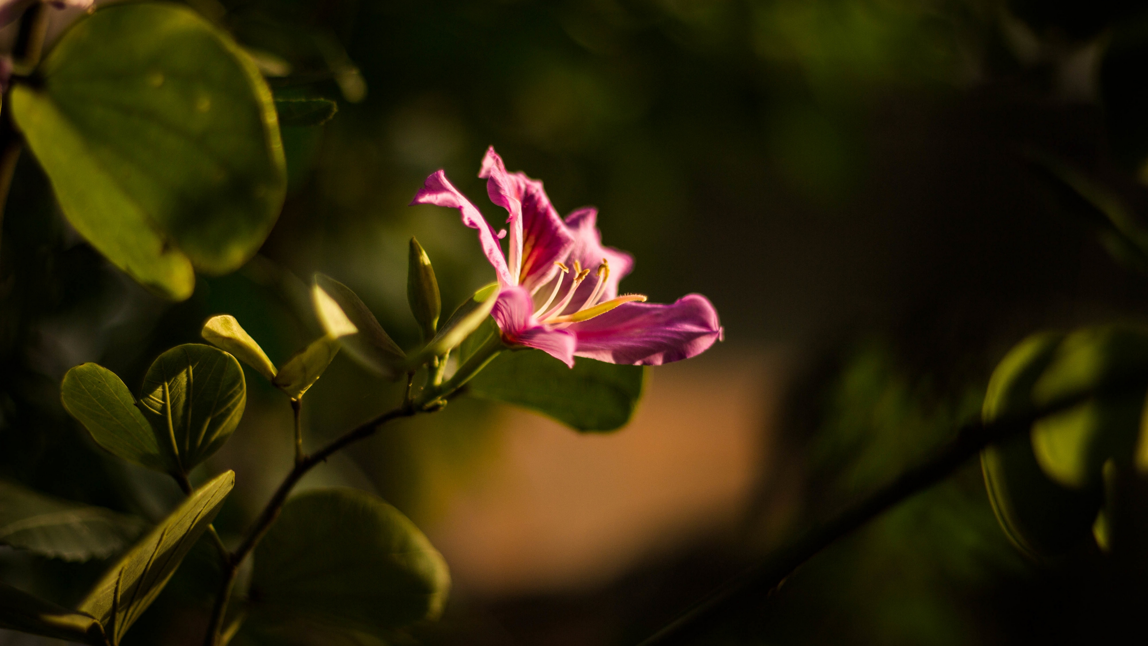 Description: A pink flower with green leaves in the background and a blurry background behind it.