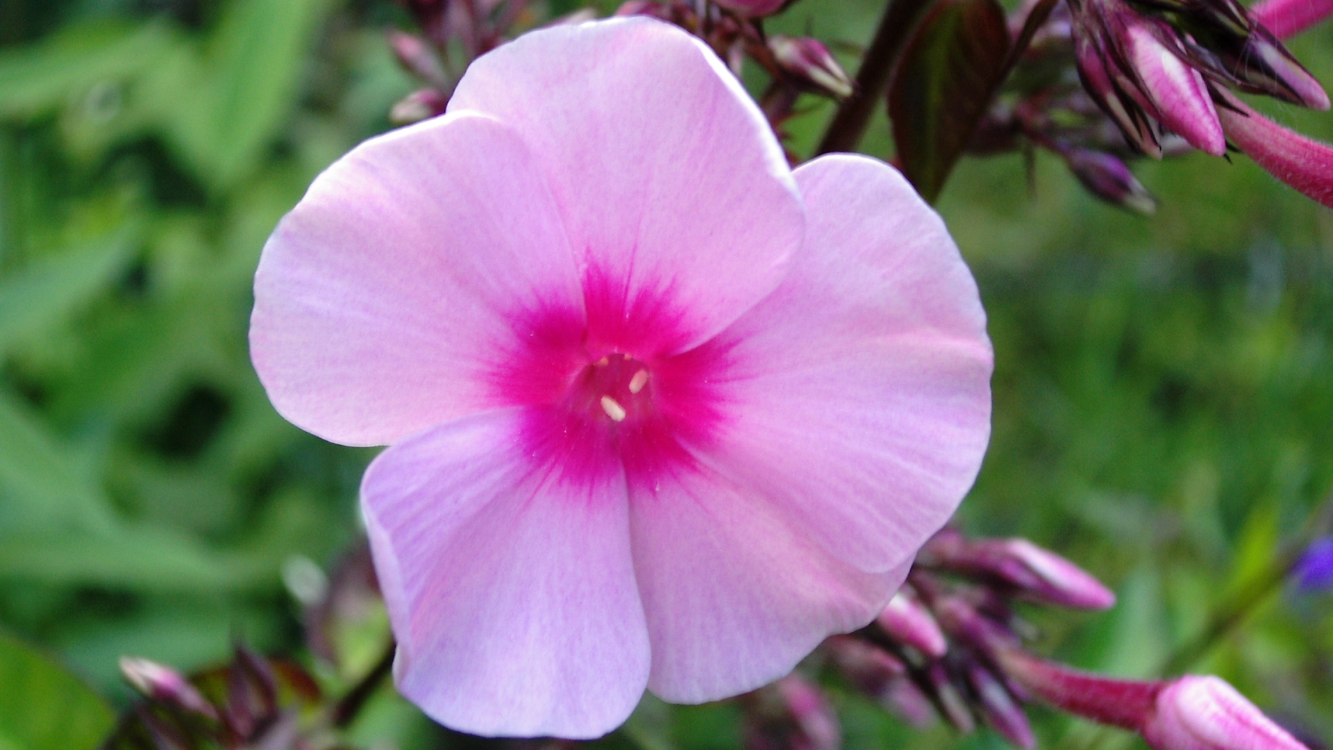 Description: A pink flower with a pink center surrounded by green leaves and purple flowers in the background.