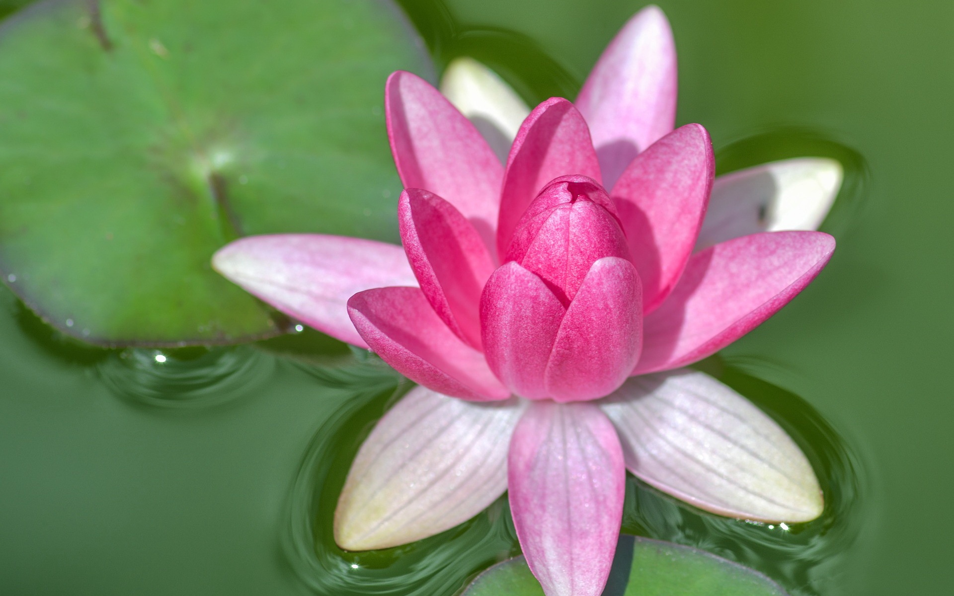 Description: A pink flower floating on top of a green pond with leaves around it and a green leaf in the middle.