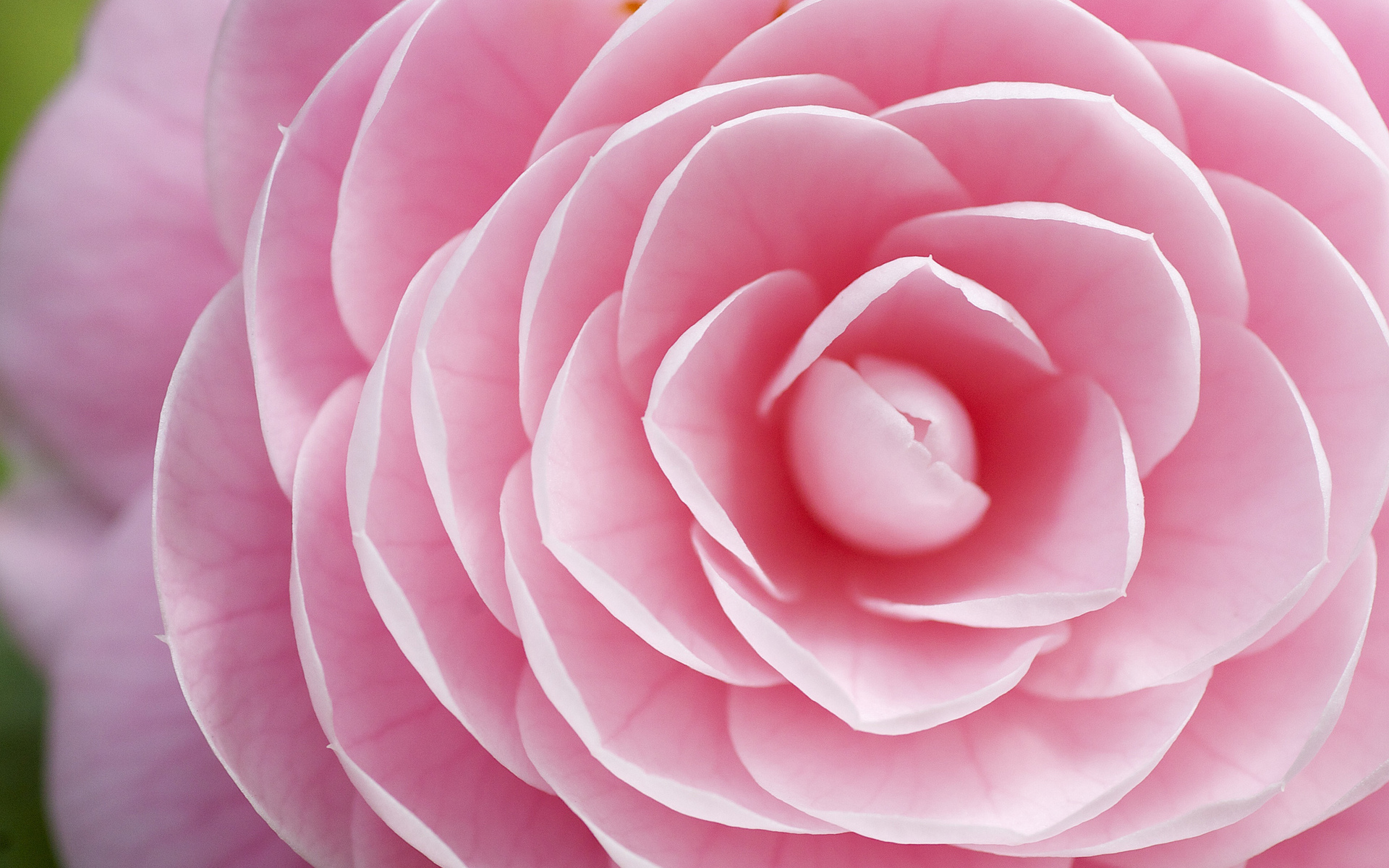 Description: A close up of a pink flower with a green background and a white center and a yellow center in the center.