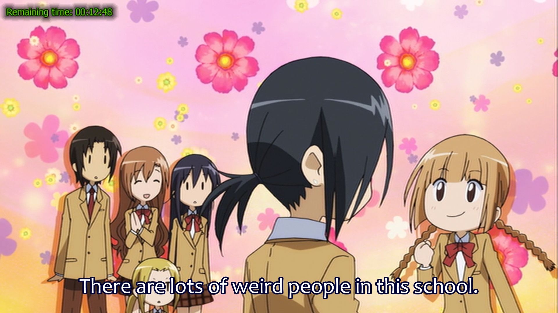 Description: A group of people standing in front of a pink flower background with a quote from the anime that reads there are lots of weird people in this school.