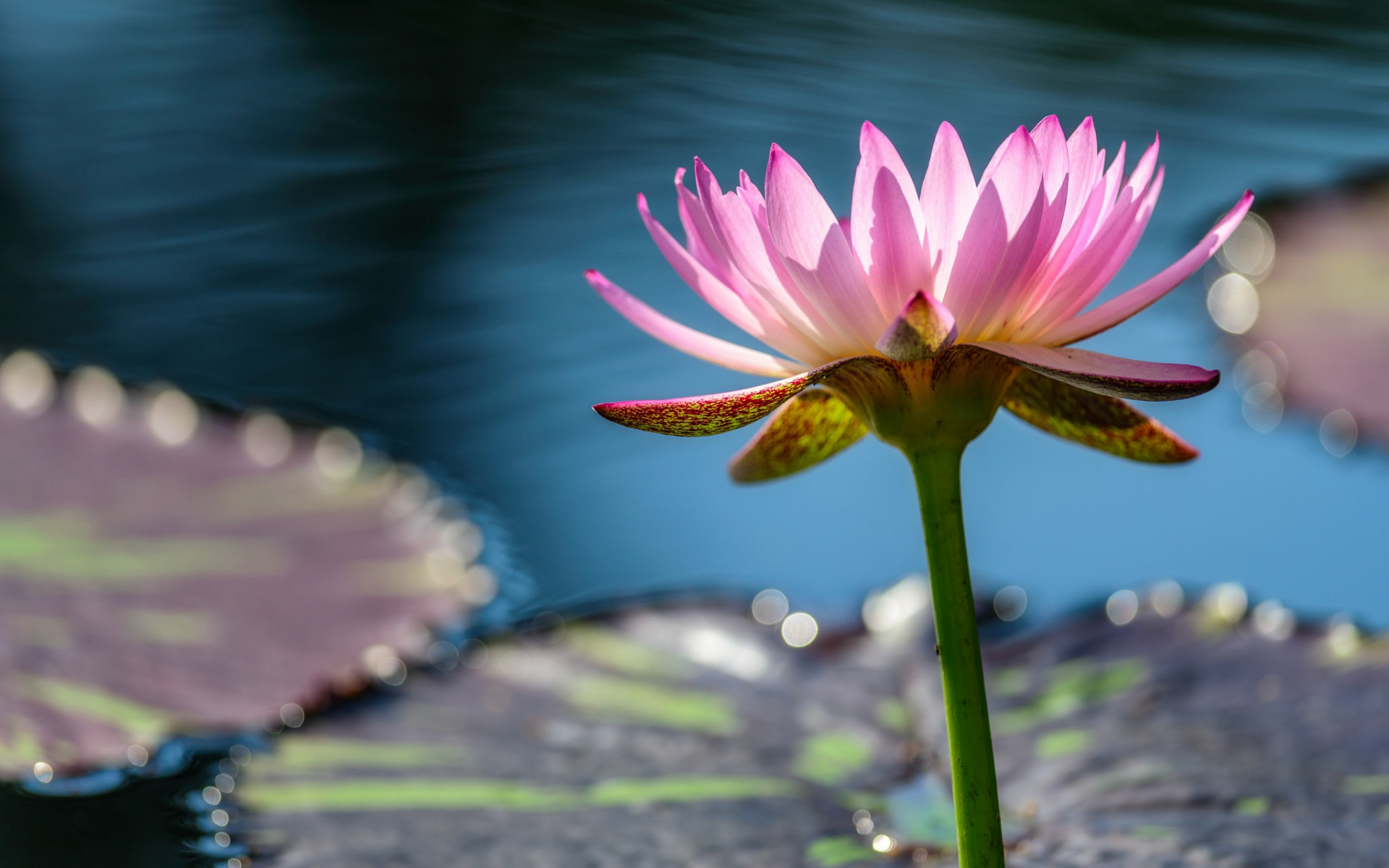 Description: A pink flower is blooming on a lily pad in the water with lily pads around it and a blue sky in the background.