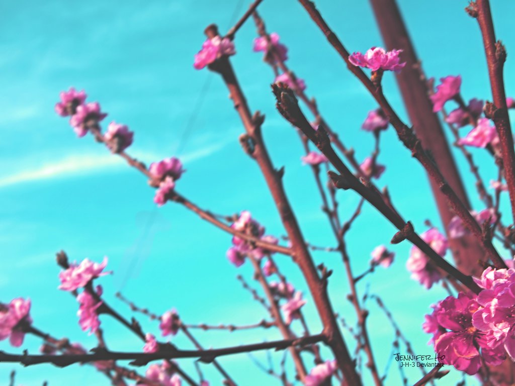 Description: A tree with pink flowers in the foreground and a blue sky in the background with a few clouds.