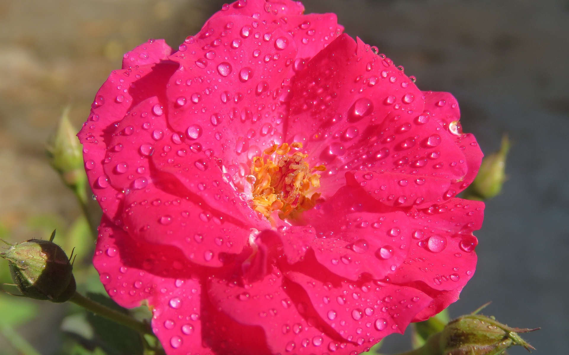Description: A pink flower with water droplets on it's petals and leaves in the background.