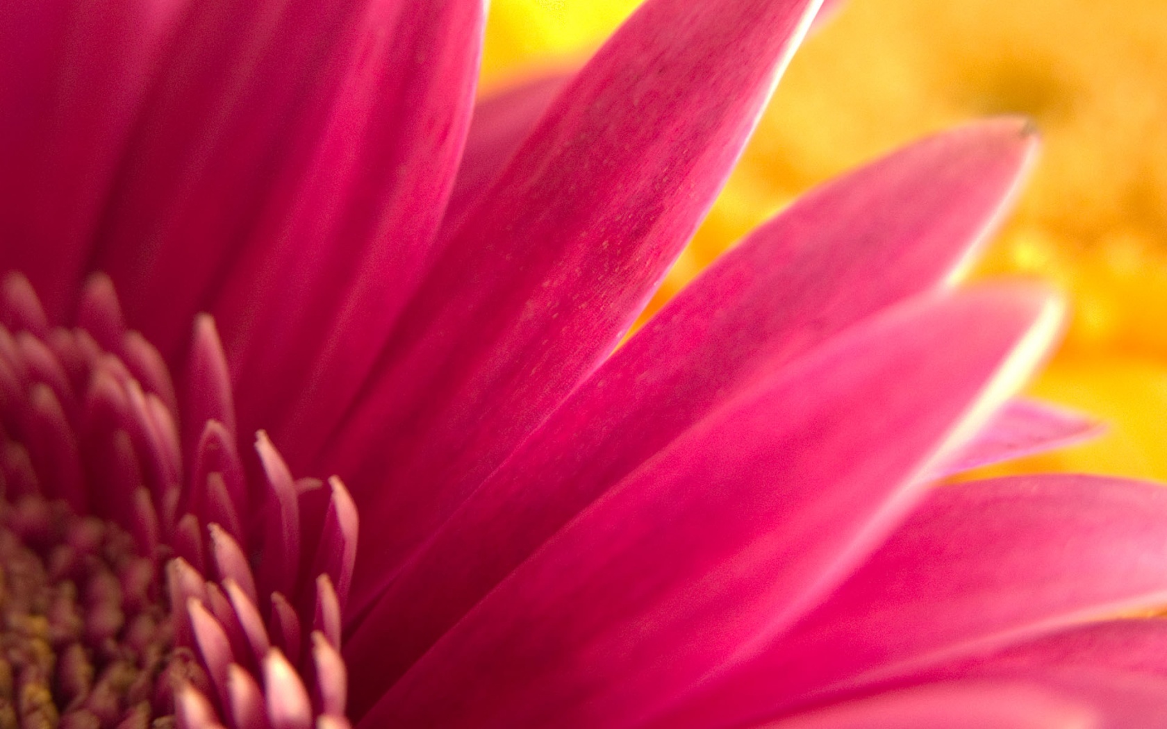 Description: A close up of a pink flower with yellow background and a blurry image of a flower in the background.