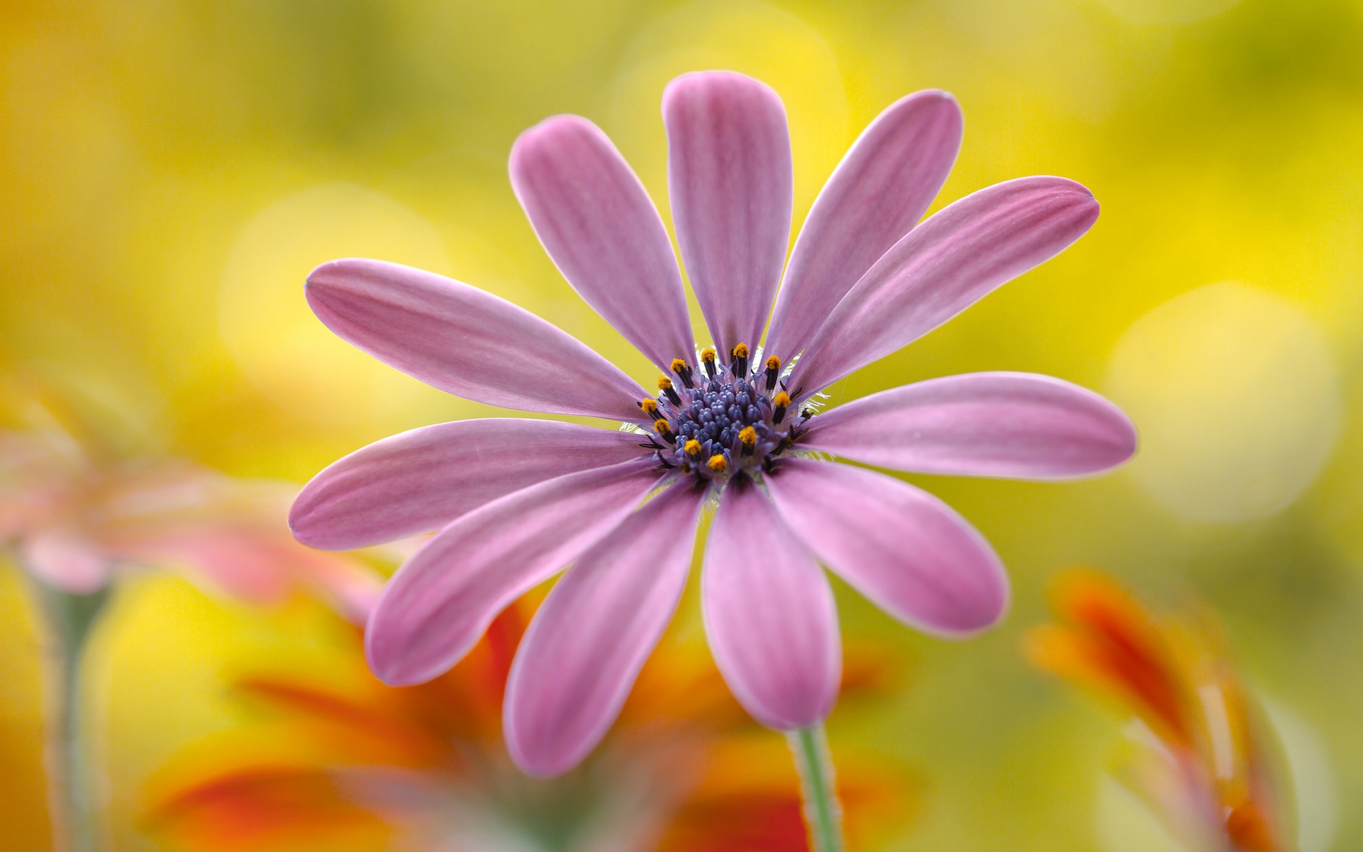 Description: A close up of a pink flower with yellow background and blurry flowers in the background.