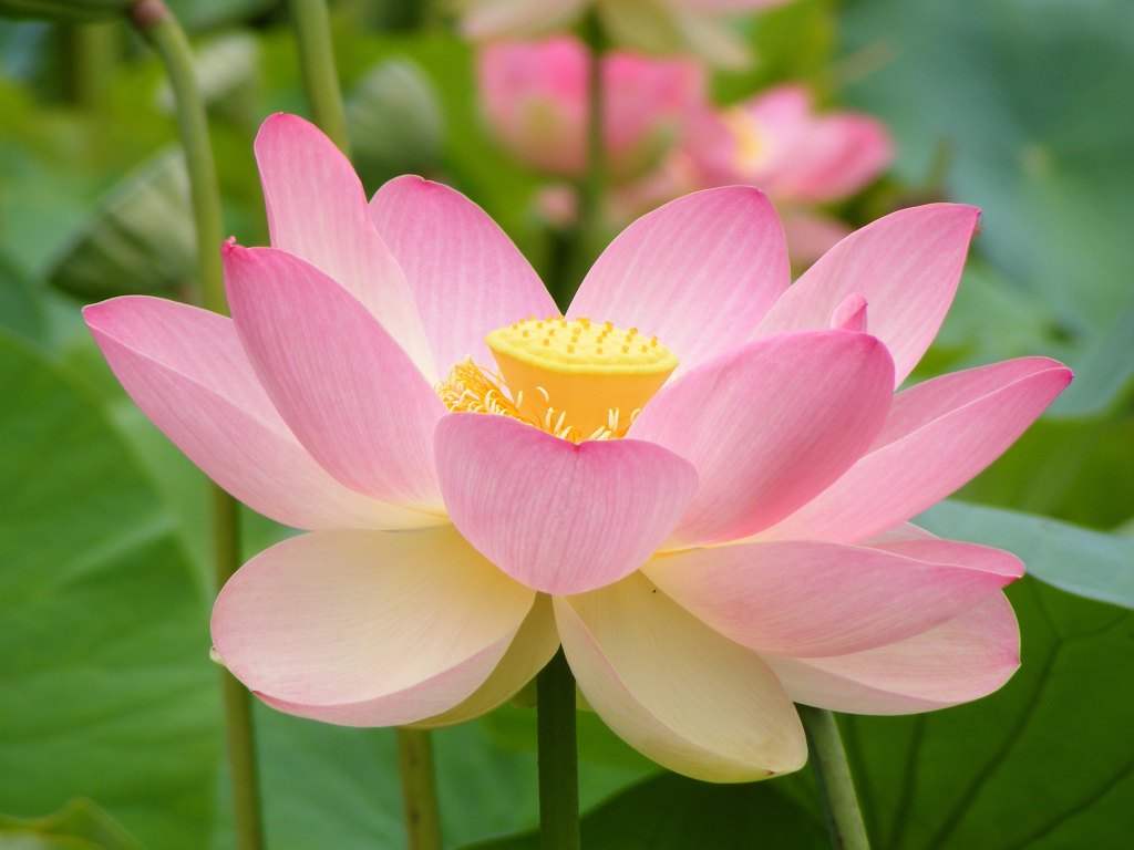 Description: A pink flower with yellow center surrounded by green leaves and flowers in the background.