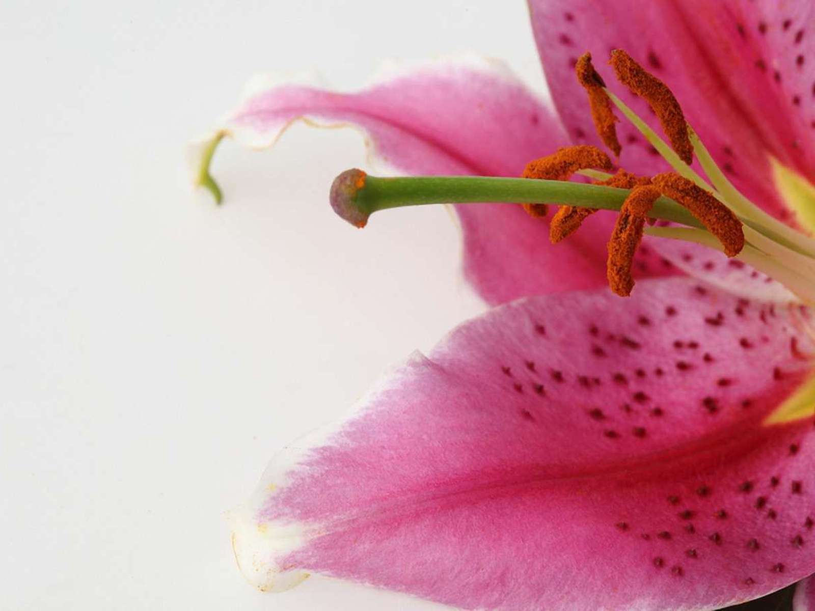 Description: A pink flower with a yellow stamen on a white background with a black spot in the center of the flower.