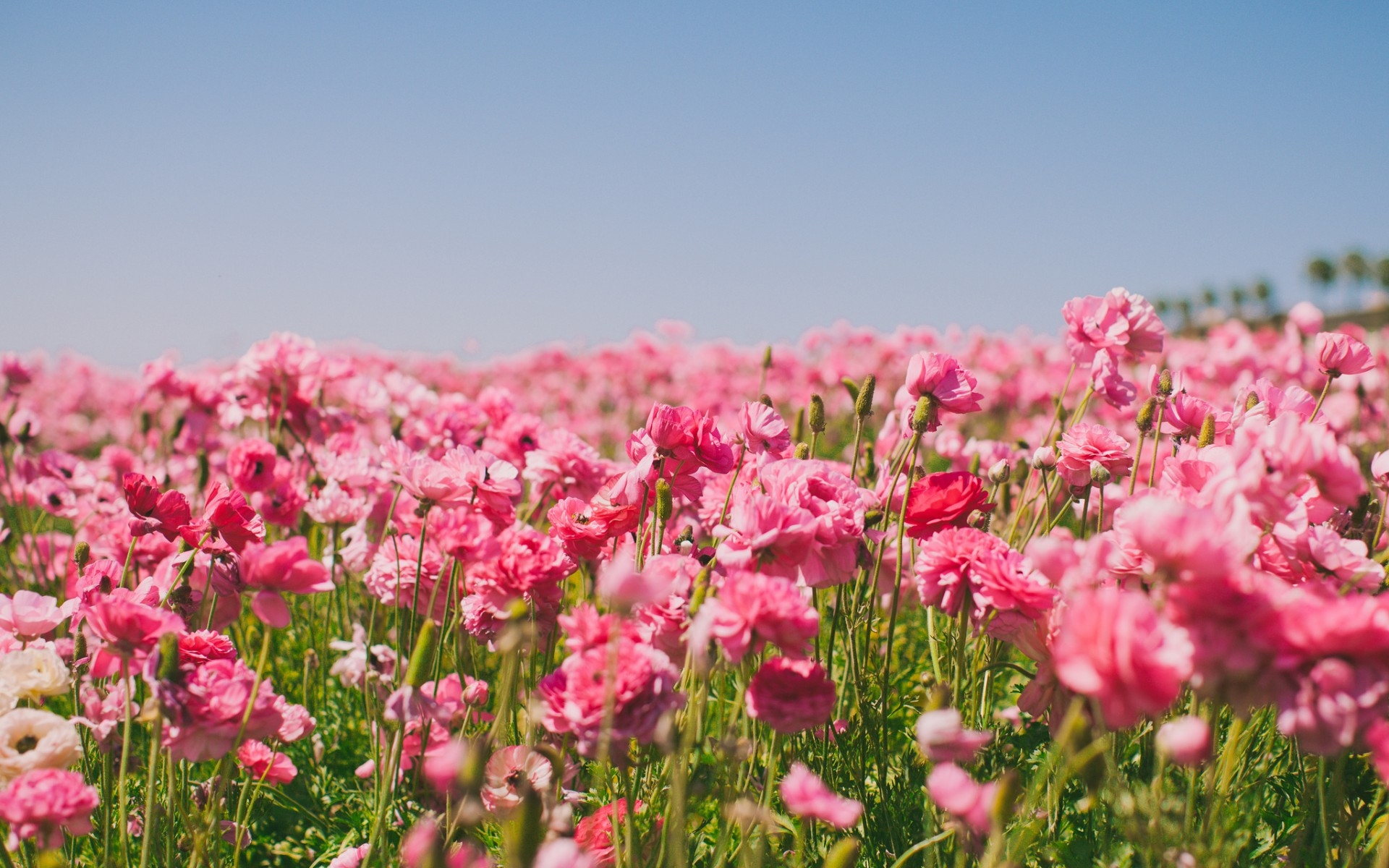 Description: A field of pink flowers with a blue sky in the background and a few white flowers in the foreground.