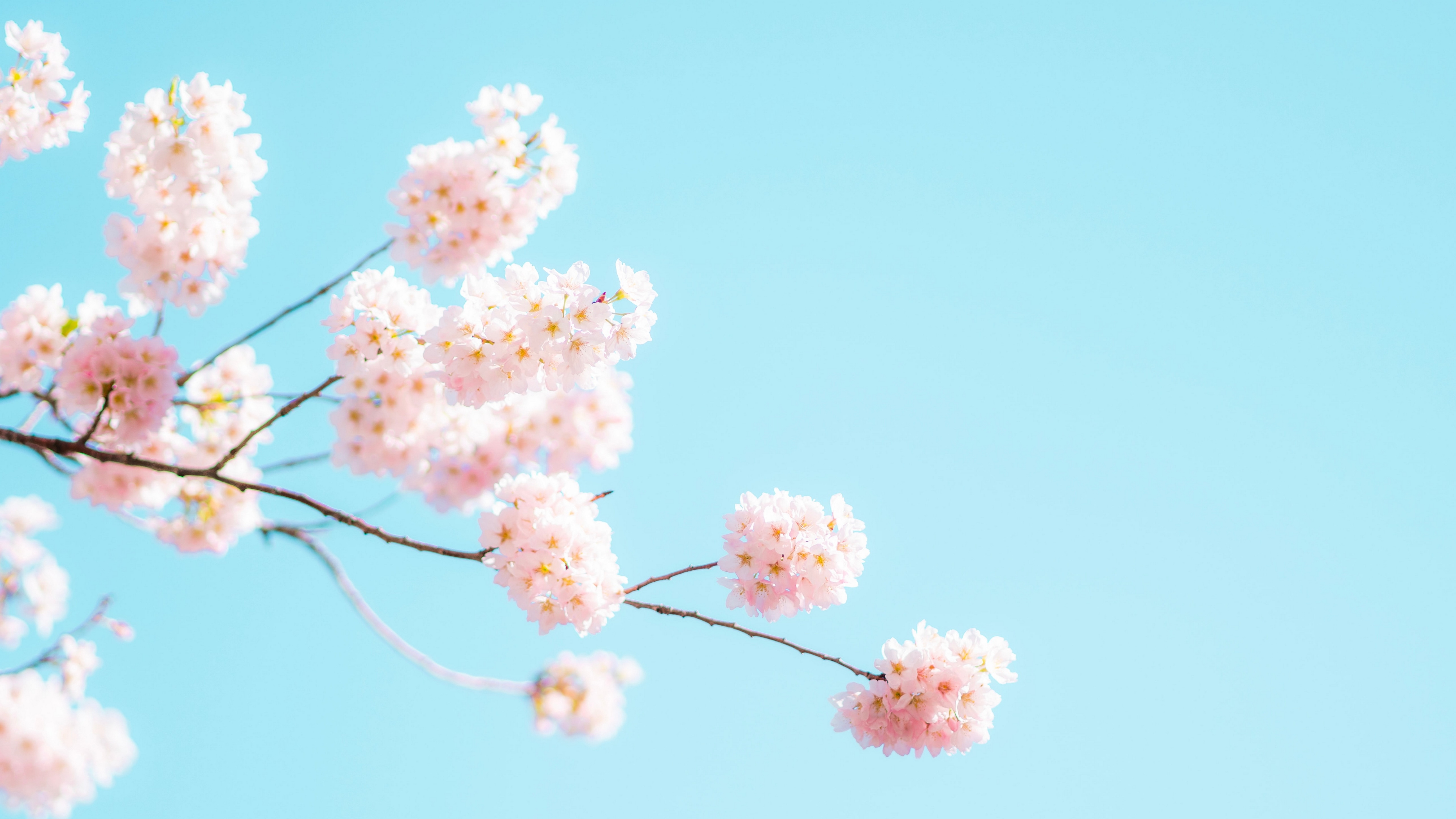 Description: A branch of a tree with pink flowers on it against a blue sky background with a few clouds in the distance.