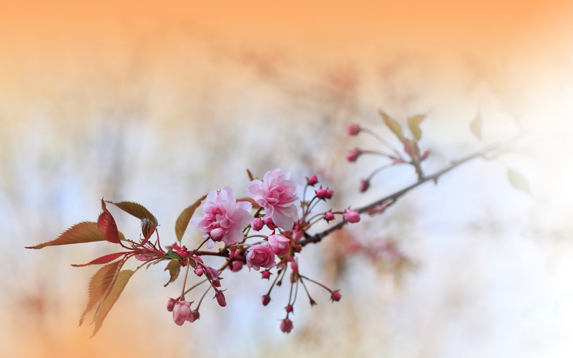 Description: A branch with pink flowers and green leaves on it.