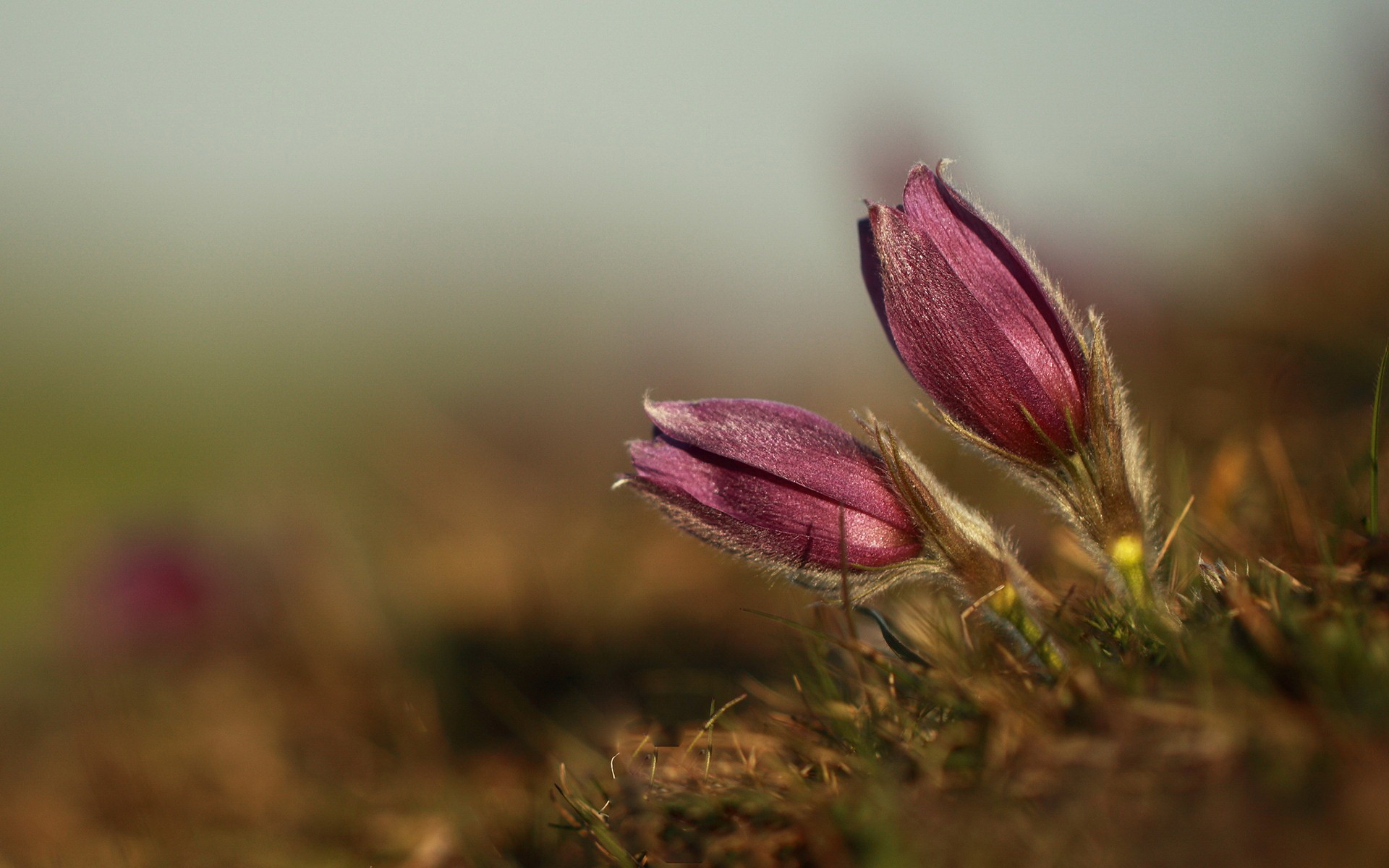 Description: Two pink flowers are growing in the grass on a sunny day in the field.