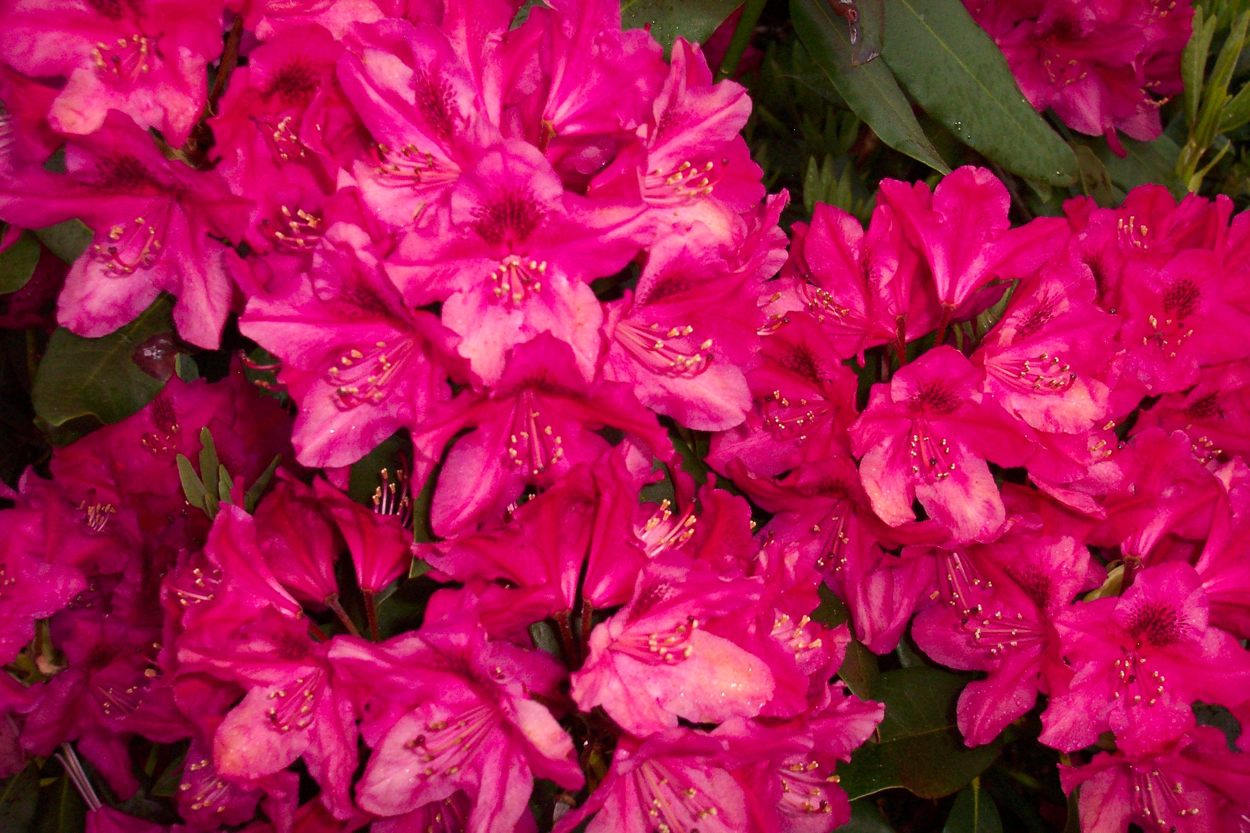 Description: A bunch of pink flowers with green leaves on them and water droplets on them.