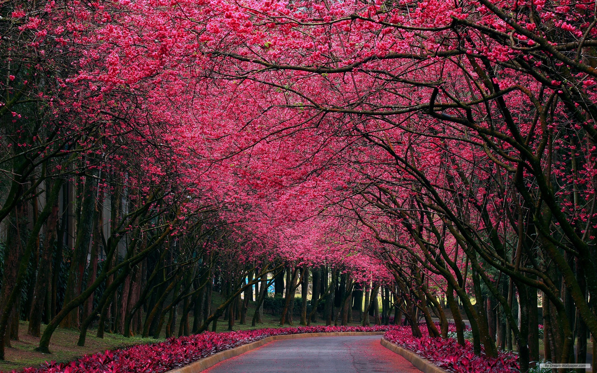 Description: A road lined with trees with pink flowers on them and a red carpet of leaves on the ground and the trees lining the road.