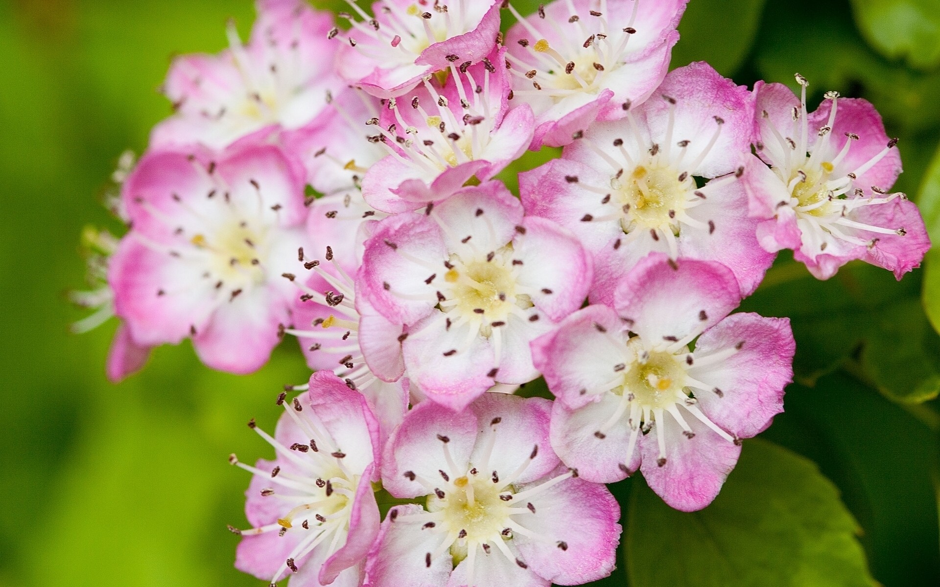 Description: A bunch of pink flowers with white centers on a green background with leaves and stems in the foreground.