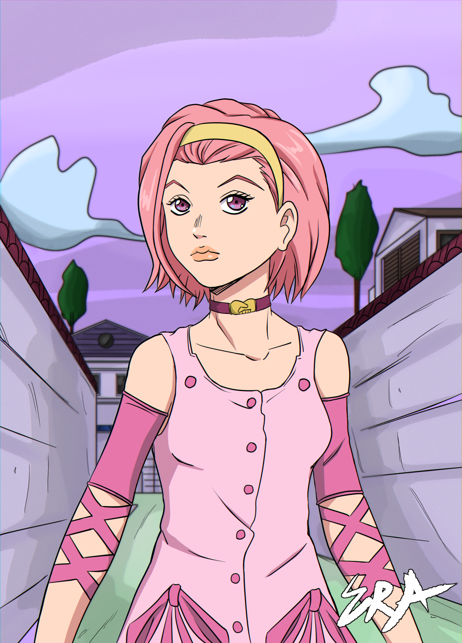 Description: A cartoon girl with pink hair and pink dress and pink gloves on her arm and a pink shirt on her shoulder.