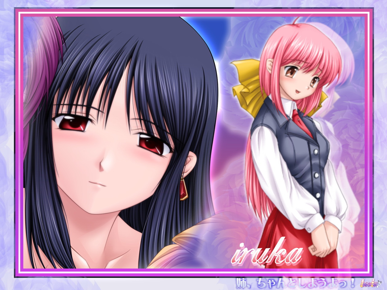 Description: A girl with pink hair and a black and white shirt and a pink and white shirt and a pink and blue background.