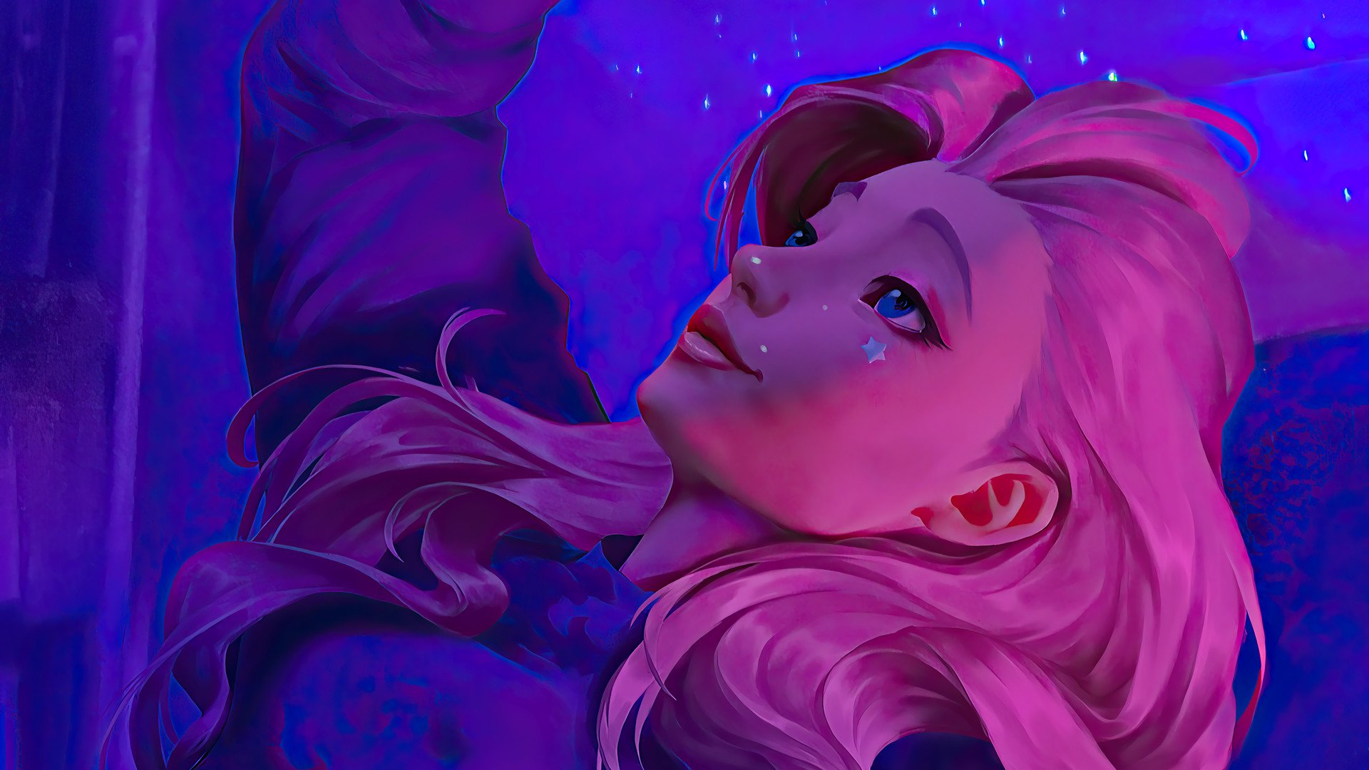 Description: A woman with pink hair and blue eyes is looking up at something in the air with her hand on her hip.