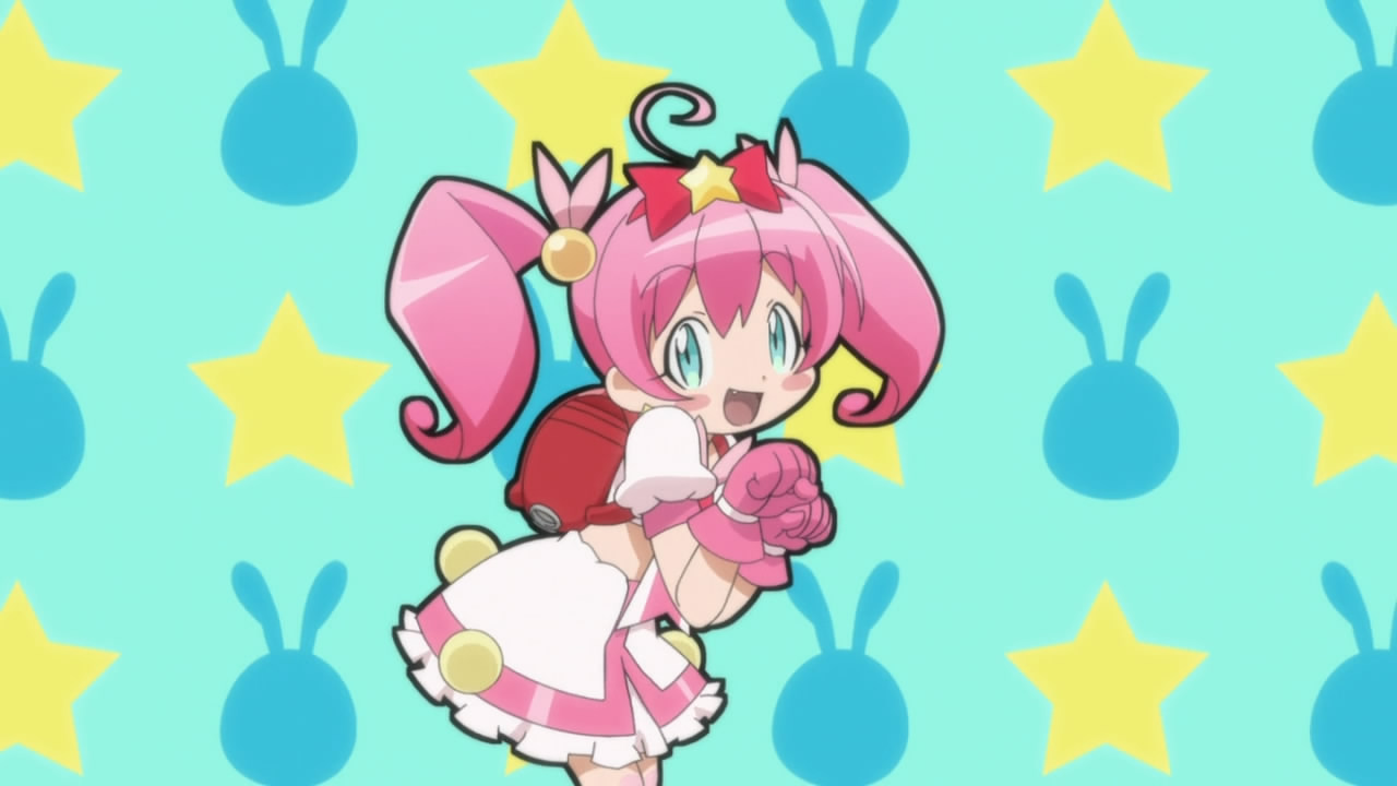 Description: A cartoon character with pink hair and a pink dress on a blue background with stars and shapes in the background.