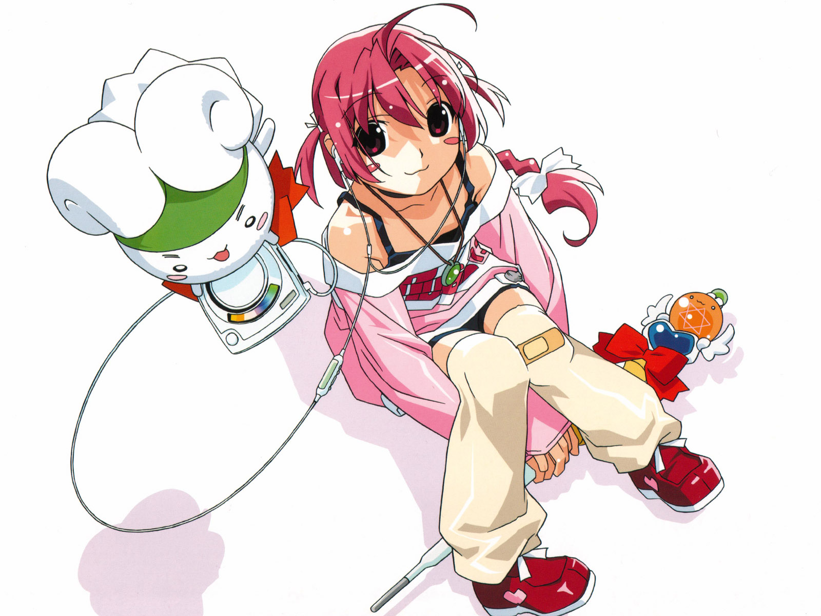 Description: A girl with pink hair and a chef hat sitting on a floor with a mixer in her hand and a chef hat on her head.