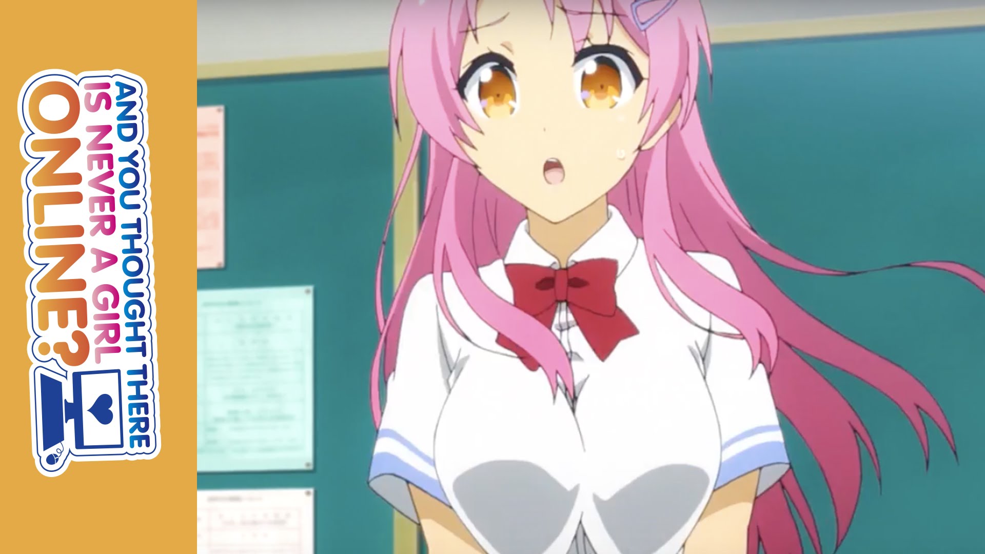 Description: A girl with pink hair and a bow tie in a classroom with a yellow wall and a sign that says online games.