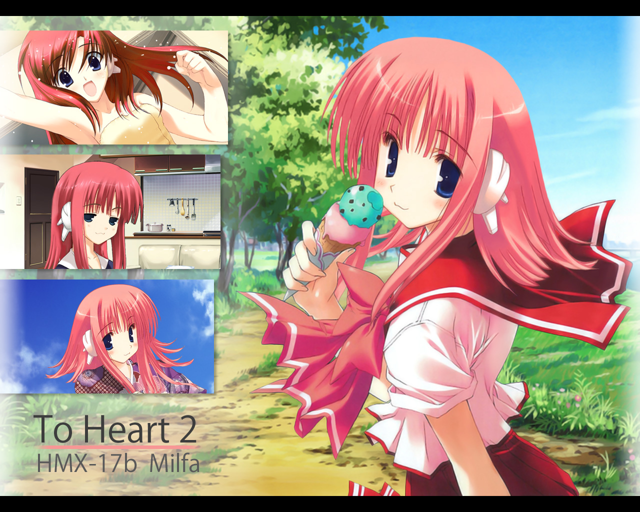 Description: A girl with pink hair holding a donut in her hand and a picture of her face with a donut in her hand.
