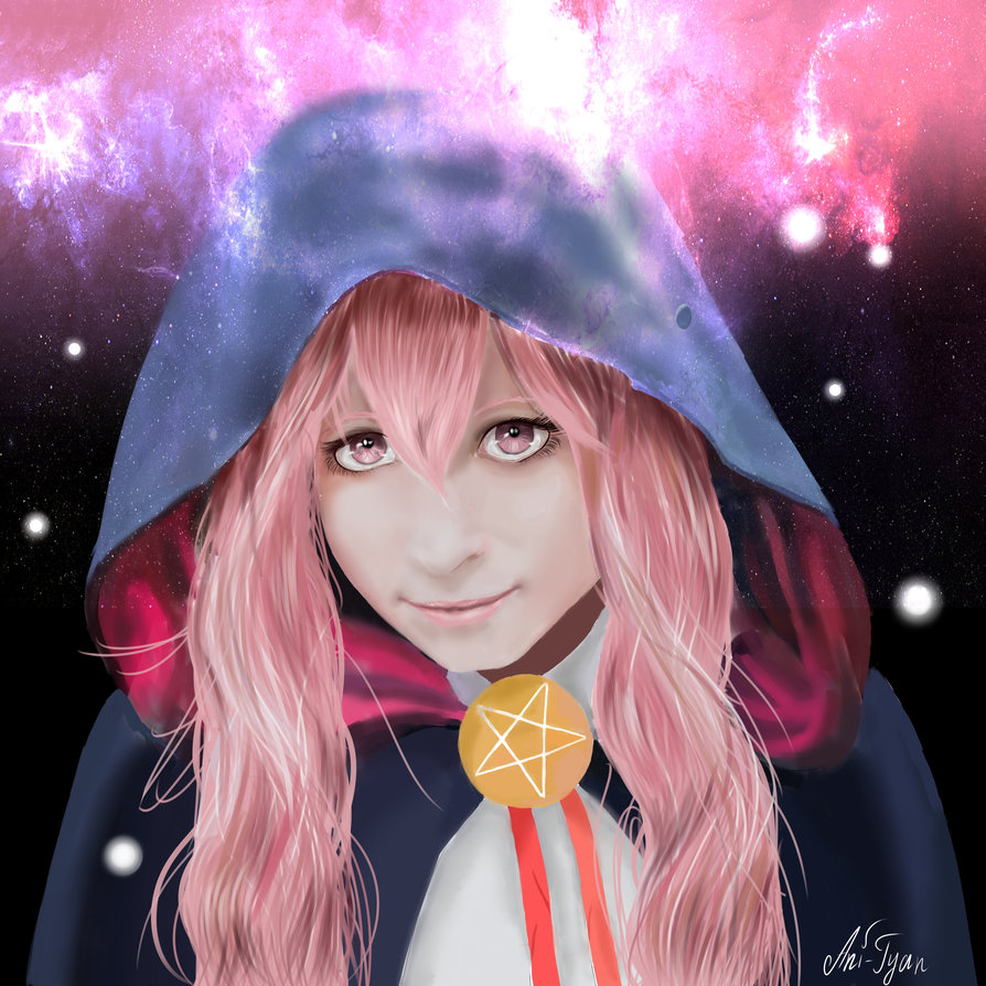 Description: A girl with pink hair and a blue hat is holding a gold medal in front of a galaxy background.