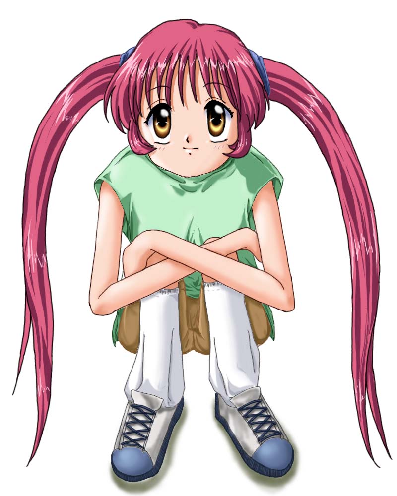 Description: A girl with pink hair and a green shirt sitting on a stool with her arms crossed and her legs crossed.