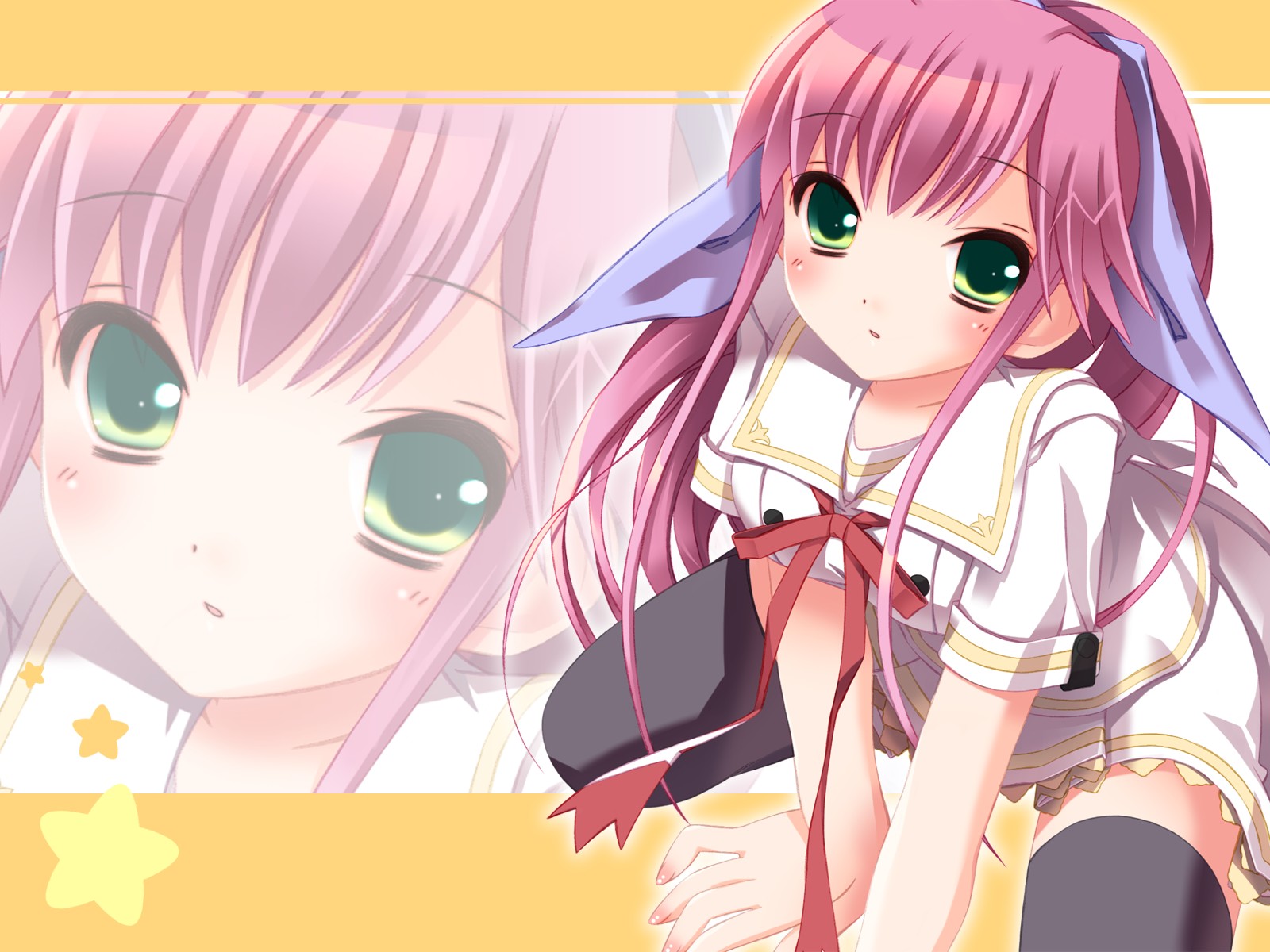 Description: A girl with pink hair and green eyes is next to a girl with pink hair and green eyes and a yellow background.