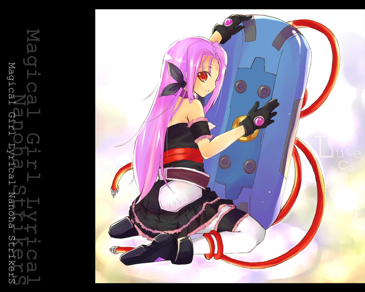 Description: A woman with pink hair and black gloves sitting on a blue and red object with a red ribbon around her neck.