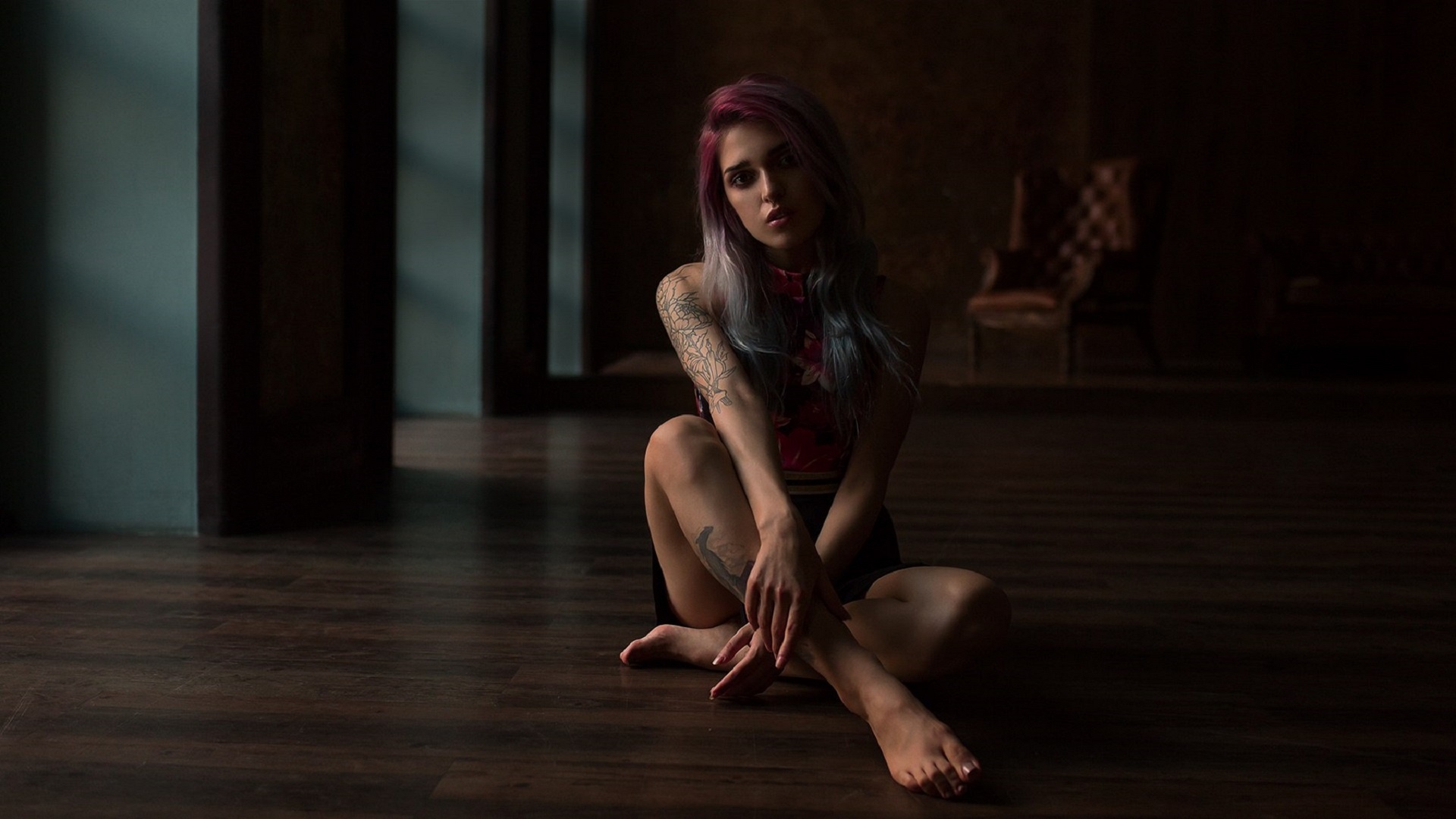 Description: A woman with pink hair sitting on the floor in a dark room with her hands on her knees and her legs crossed.