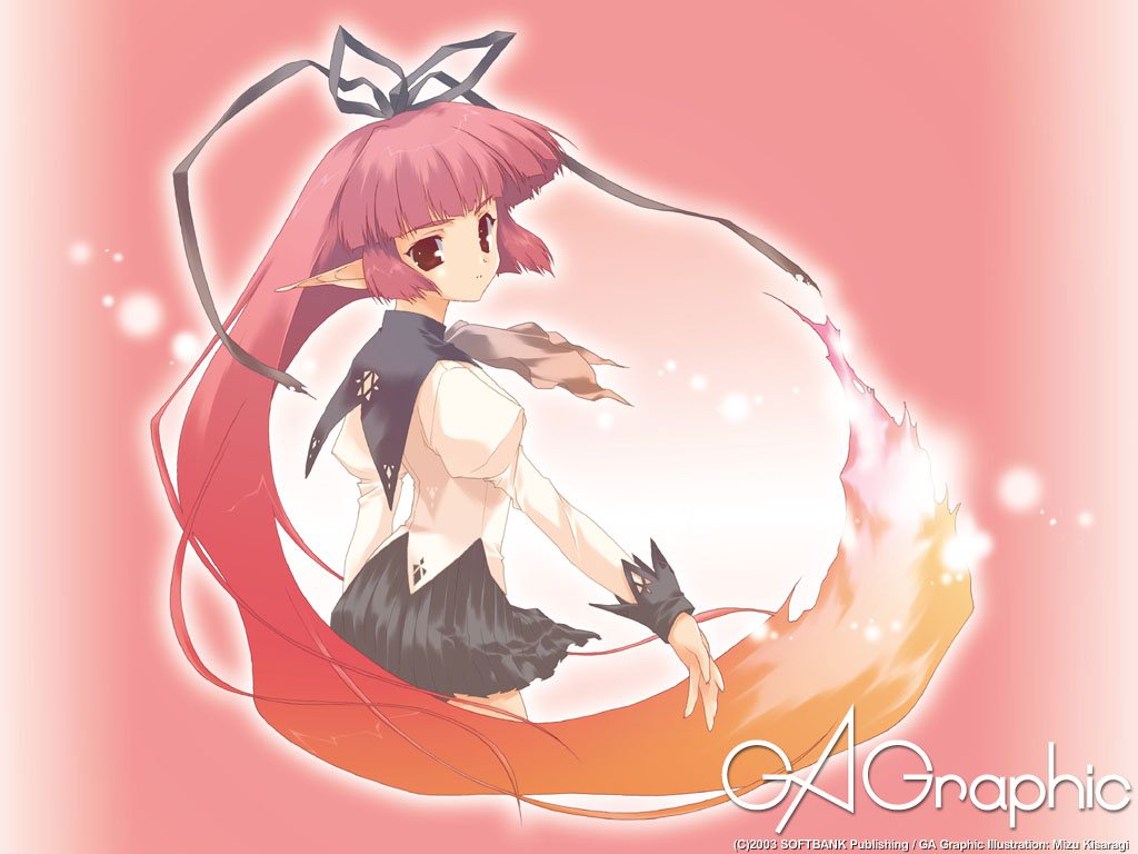Description: A girl with pink hair and a black dress is holding a red and orange tail and a pink background.