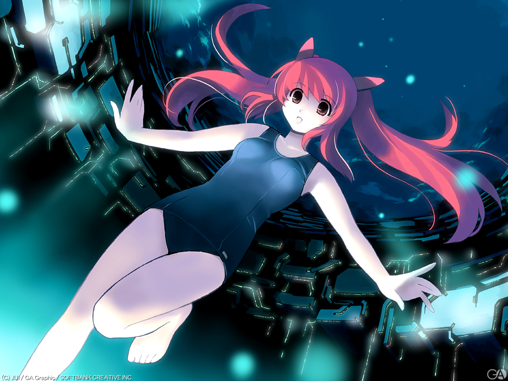 Description: A girl with pink hair is floating in the air with her arms outstretched and legs spread out.