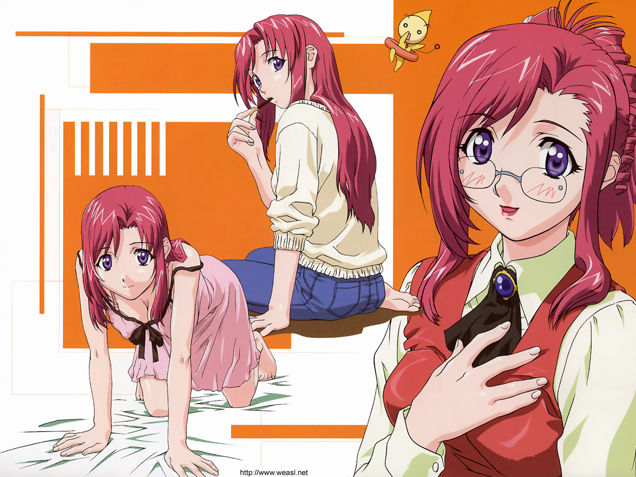 Description: A girl with pink hair and glasses is holding a cell phone and looking at the camera while sitting on the floor.