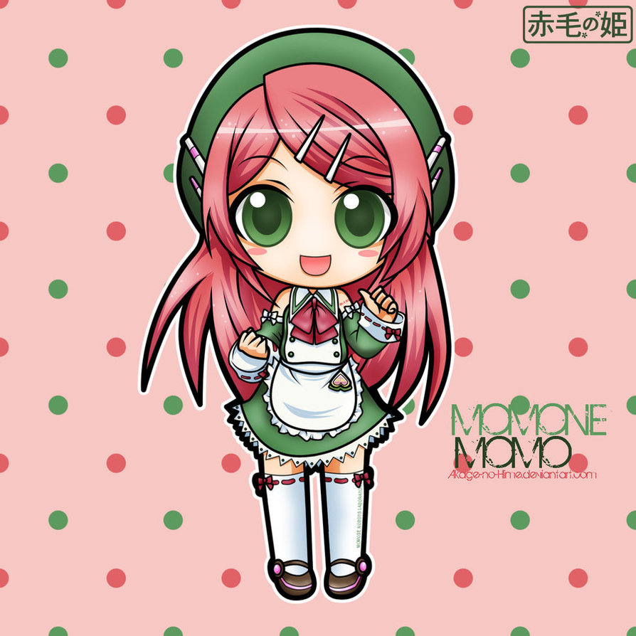 Description: A cartoon girl with pink hair and green eyes wearing a green hat and green dress and holding a white bag.