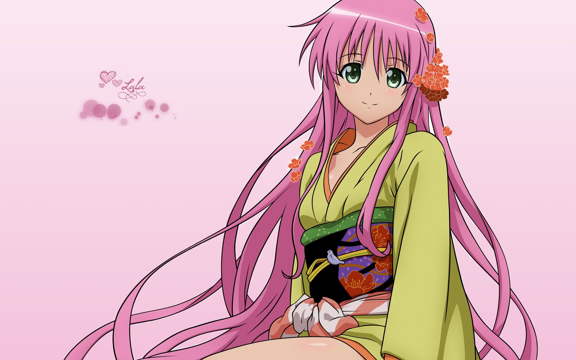 Description: A woman with pink hair and a green dress sitting on a pink background with a butterfly flying above her.